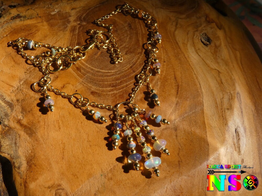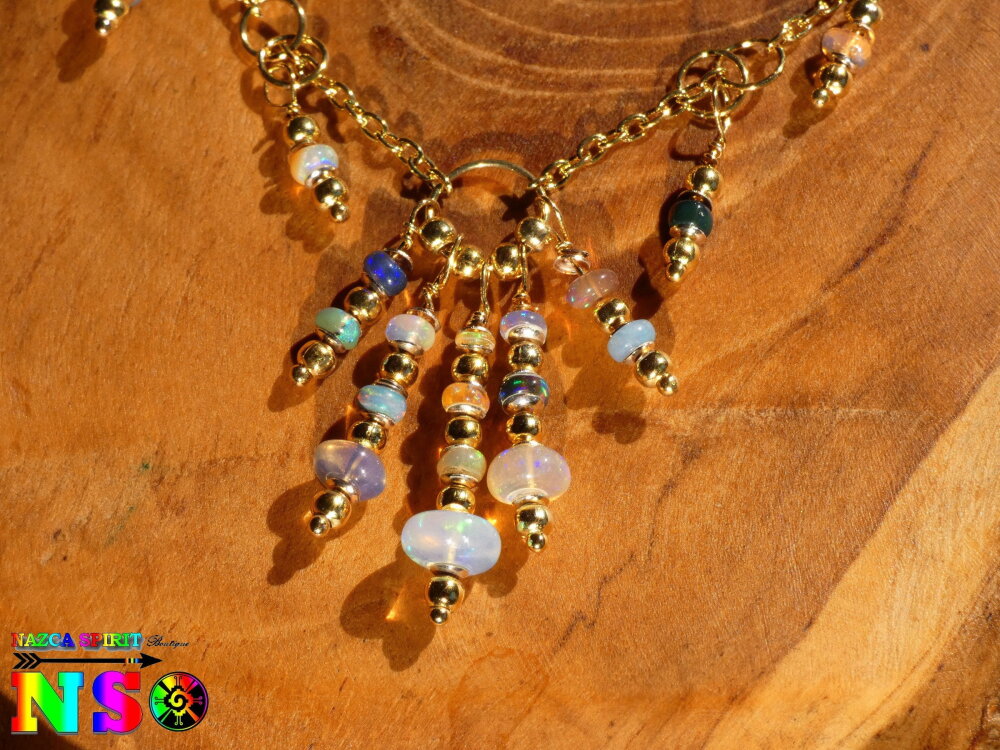 Pour réaliser ce bijou solaire, j'ai utilisé des perles en opales d'Ethiopie de différentes couleurs pour apporter une dimension colorée à cette création unique. Ce collier ras de cou bohème est composé de chaînes en laiton plaqué or 18k reliées par des anneaux en laiton plaqué or 18k. J'ai relié aux anneaux des pendants simples réalisées à la main à partir de petites perles d'opale, de petites perles rondes et de mini coupelles et fil en laiton plaqué or (entièrement monté à la main avec minutie).
