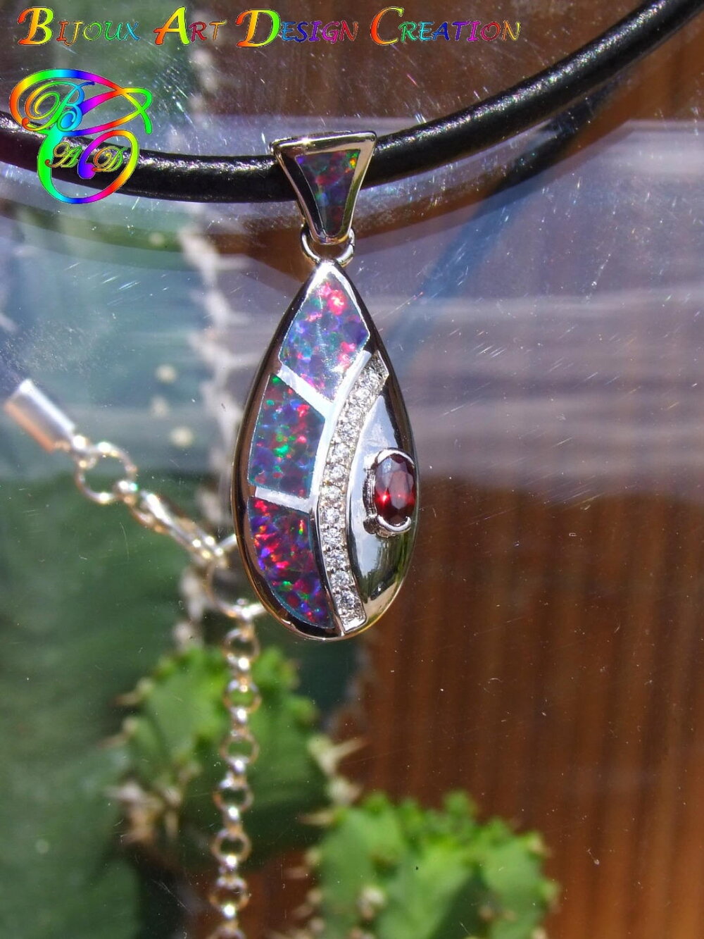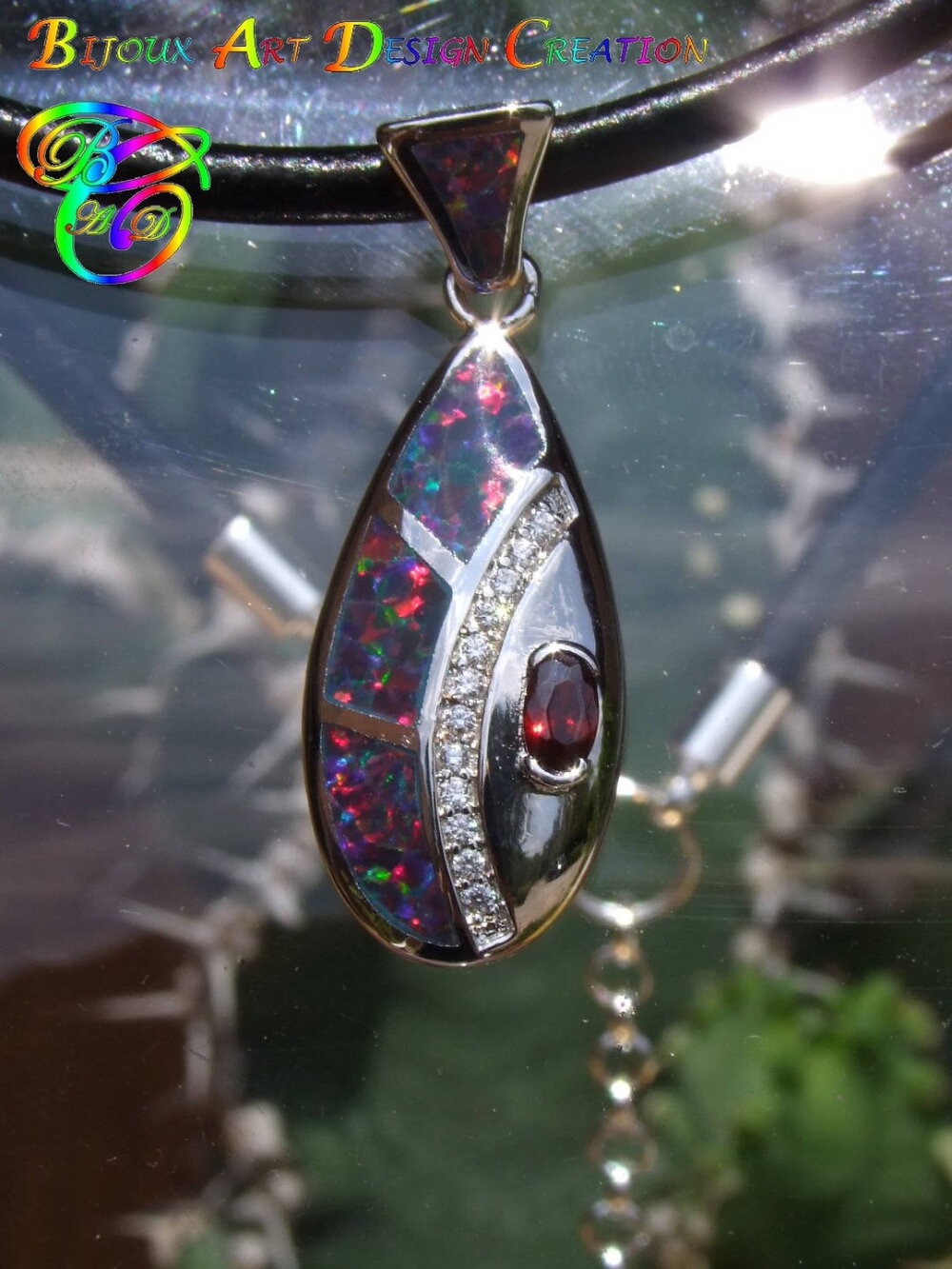 Le tour de cou est en cuir noir. J'ai relié à ce tour de cou un pendentif forme goutte en métal couleur argent brillant au centre duquel ont été sertis plusieurs opales de feu de synthèse dont la couleur dominante est le rouge grenat. Un rubis de synthèse a été également serti sur la partie gauche du pendentif. Une courbe a été ouvragée sur le 1er tiers du pendentif avec de petits strass transparents.