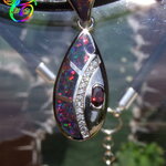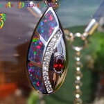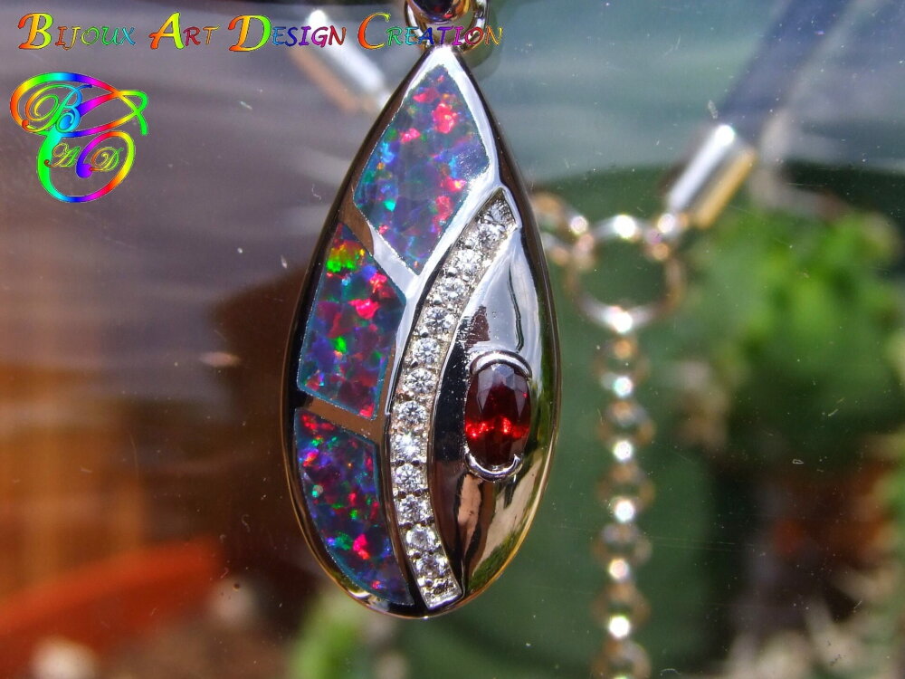 Les opales ont de superbes feux iridescents sous la lumière solaire et artificielle. Les couleurs des opales varient du bleu, au turquoise, en passant par le grenat, le vert, l'améthyste. La bélière est également sertie d'opale.