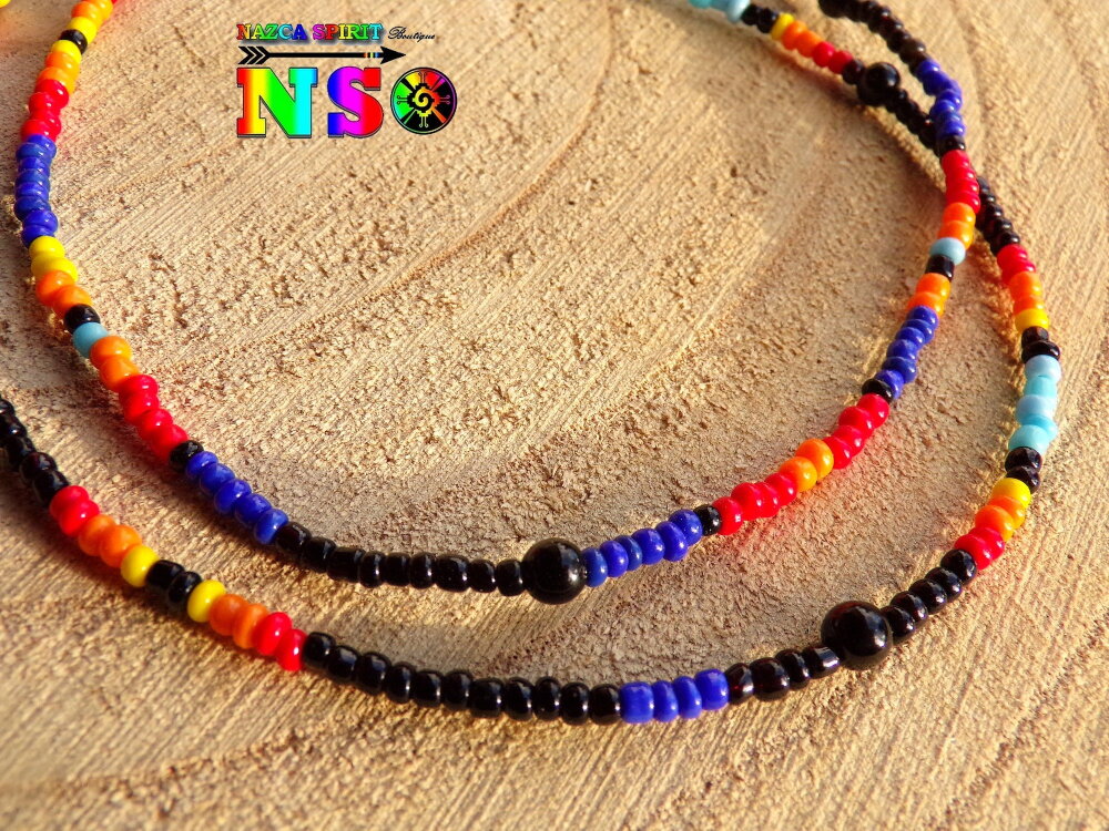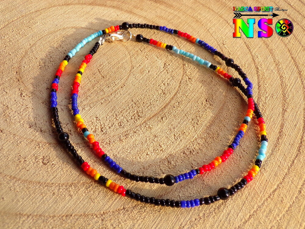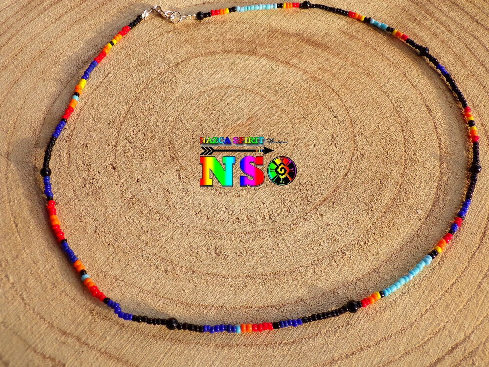Collier Ras de Cou Amérindien Inspiration Bijou Navajo - Perles de Rocaille en Verre Multicolore et Perles Rondes en Onyx Noir Naturel