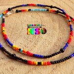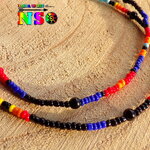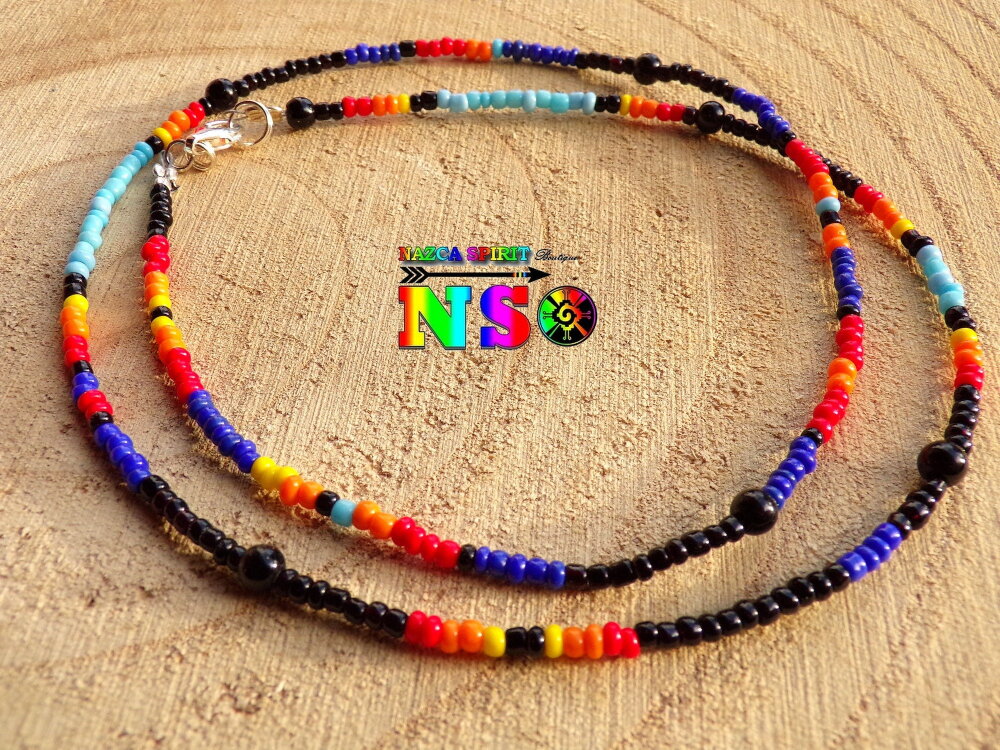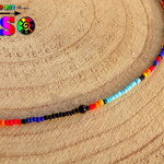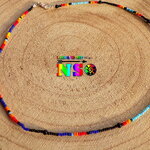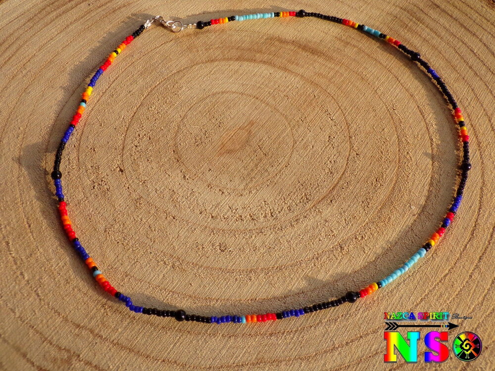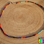 J'ai réalisé ce collier ras de cou inspiré des bijoux Navajo à partir d'anneaux doubles sécurisés, d'un fil câblé en acier gainé, de petites perles de rocaille en verre de différentes couleurs et de 7 petites perles rondes de 3 mm en véritable pierre fine d'onyx noir. J'ai utilisé des anneaux doubles et un fil d'acier gainé afin d'apporter une grand solidité au bijou.