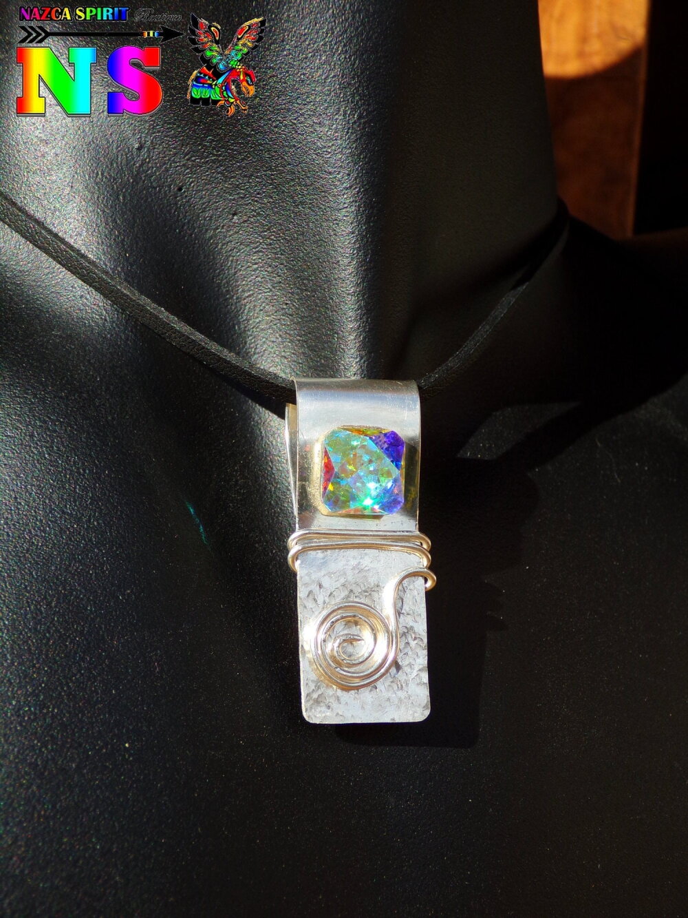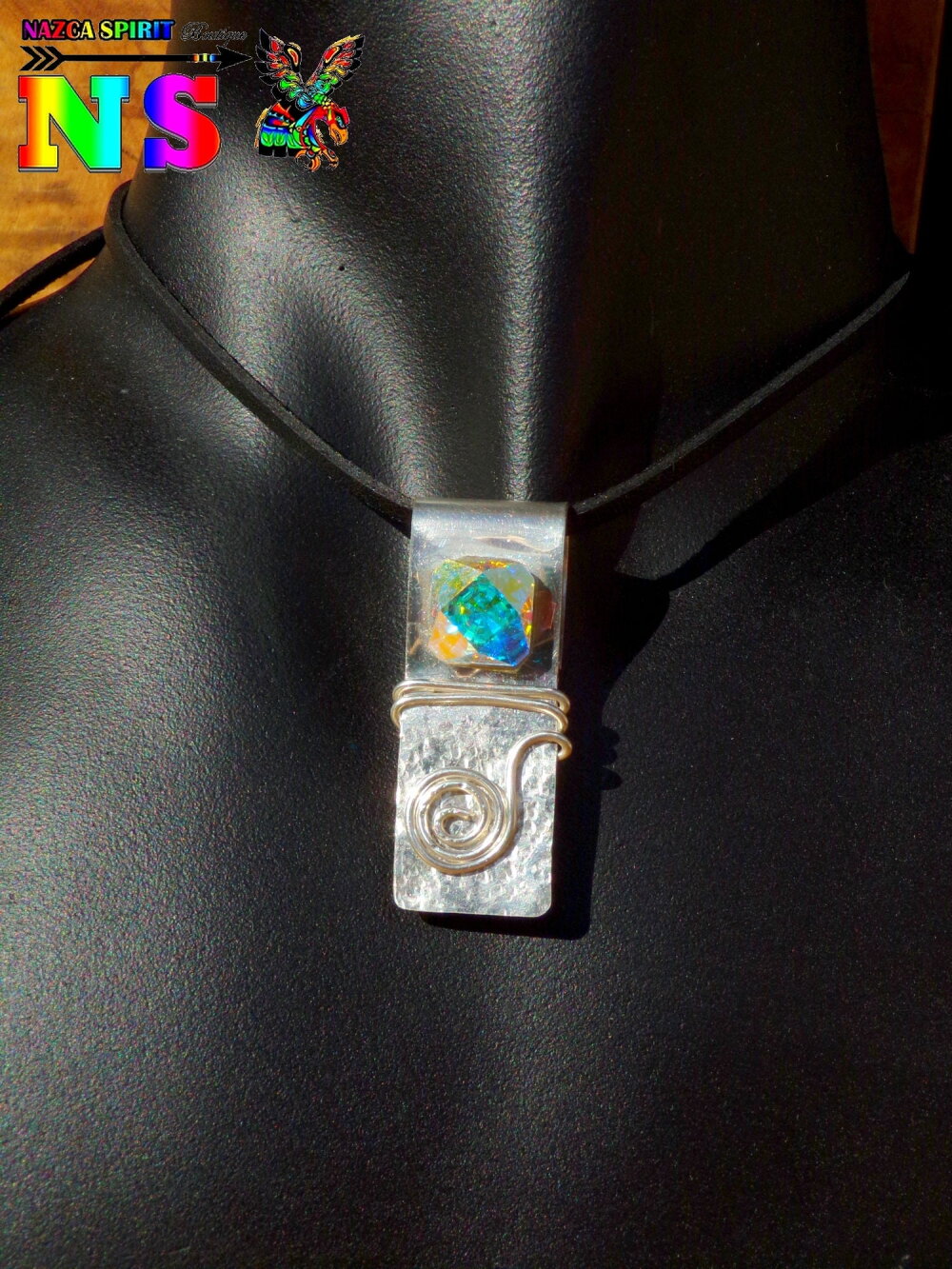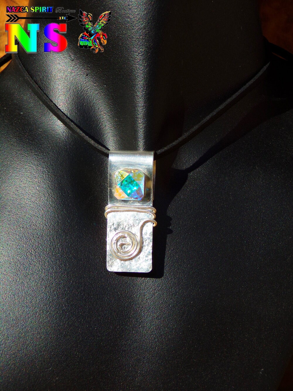 J'ai réalisé intégralement ce superbe collier aux notes bohème chic à partir d'un lacet suédine noir effet cuir, d'une plaque d'argent sterling 925 de 0.7 mm d'épaisseur, d'un fil d'argent sterling de 1 mm d'épaisseur et d'un fabuleux cristal autrichien ultra iridescent