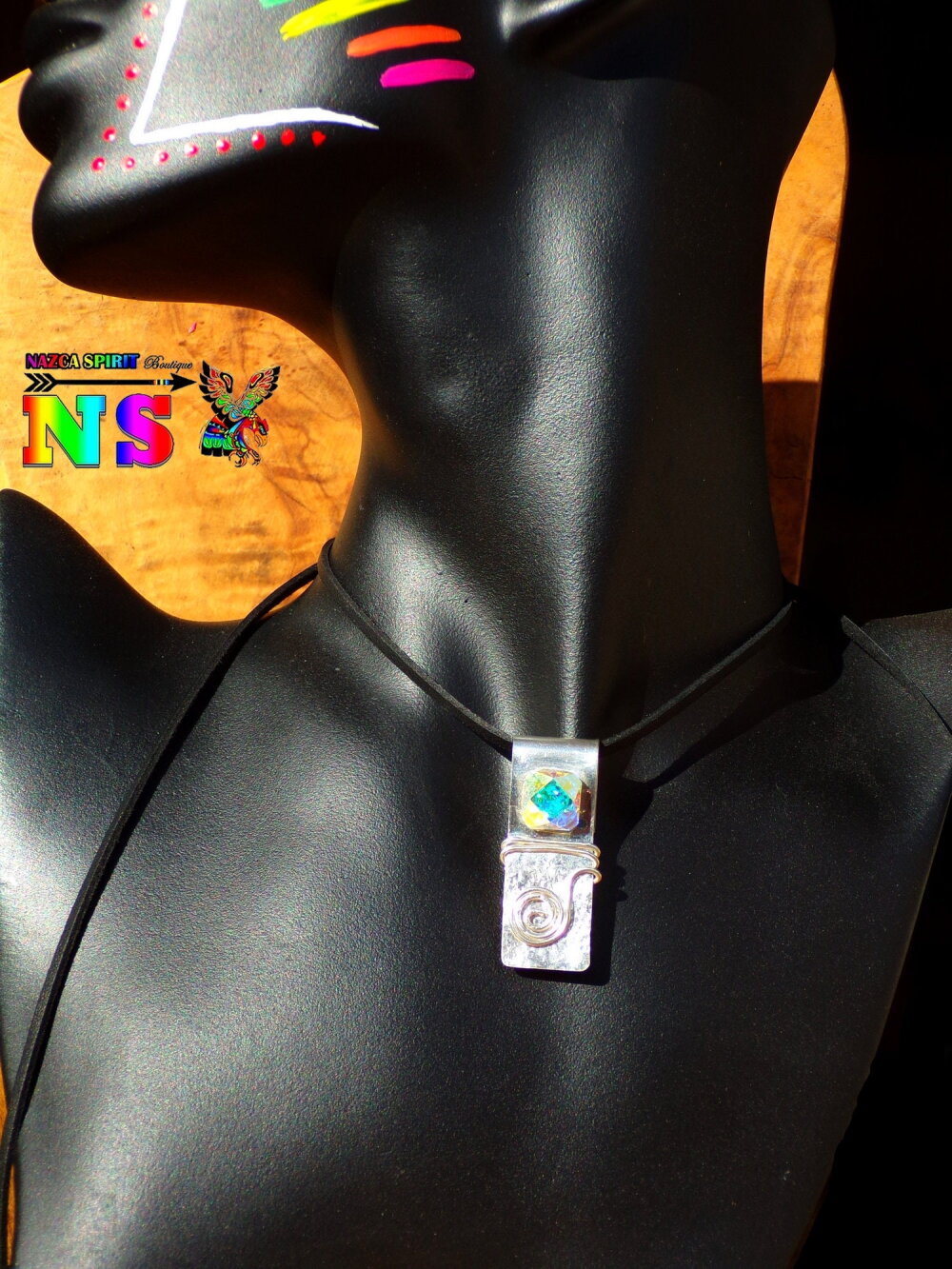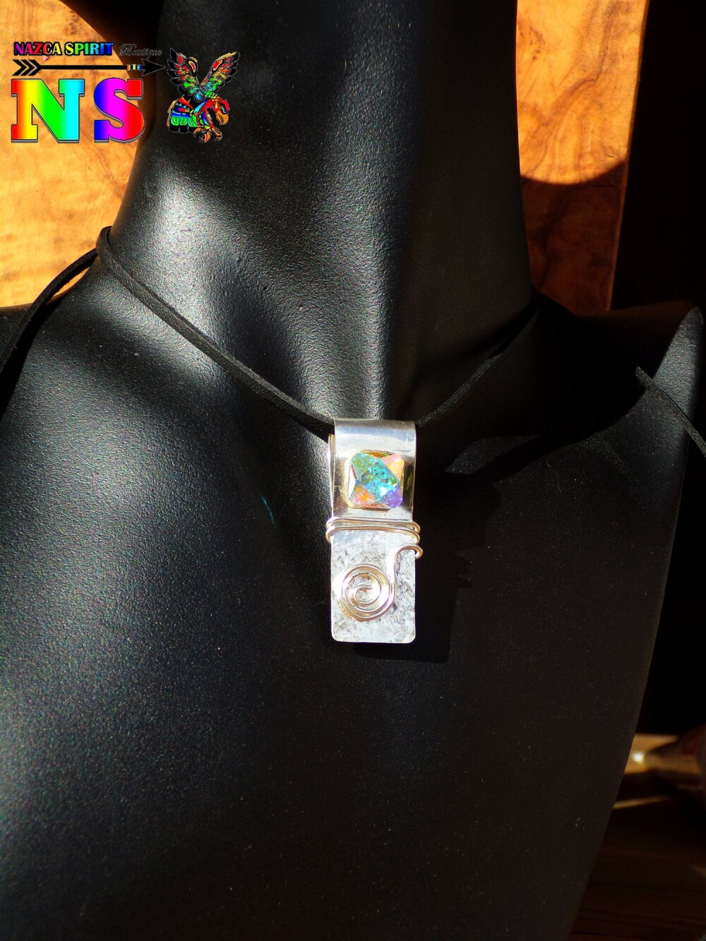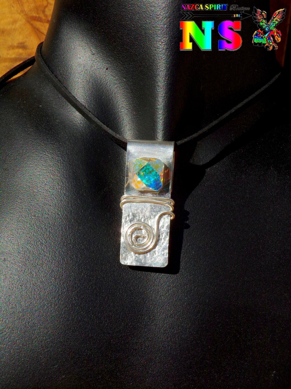 J'ai réalisé intégralement ce superbe collier aux notes bohème chic à partir d'un lacet suédine noir effet cuir, d'une plaque d'argent sterling 925 de 0.7 mm d'épaisseur, d'un fil d'argent sterling de 1 mm d'épaisseur et d'un fabuleux cristal autrichien ultra iridescent