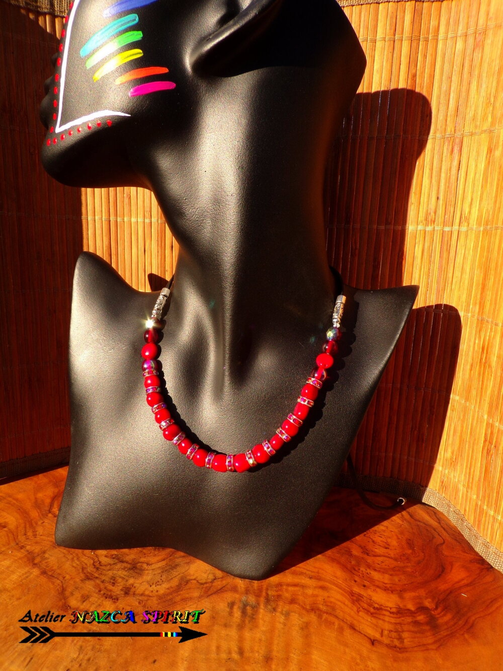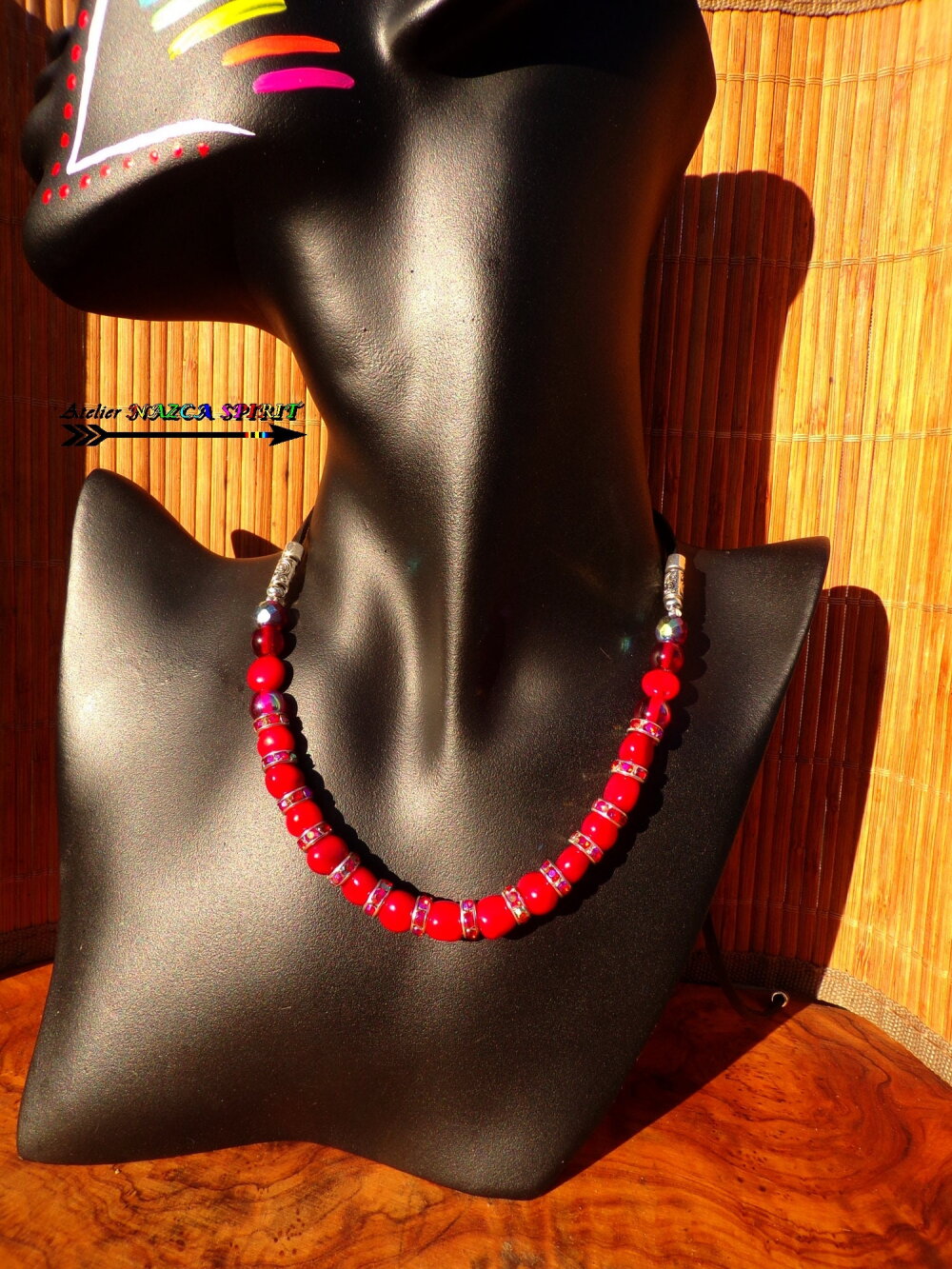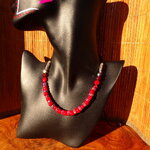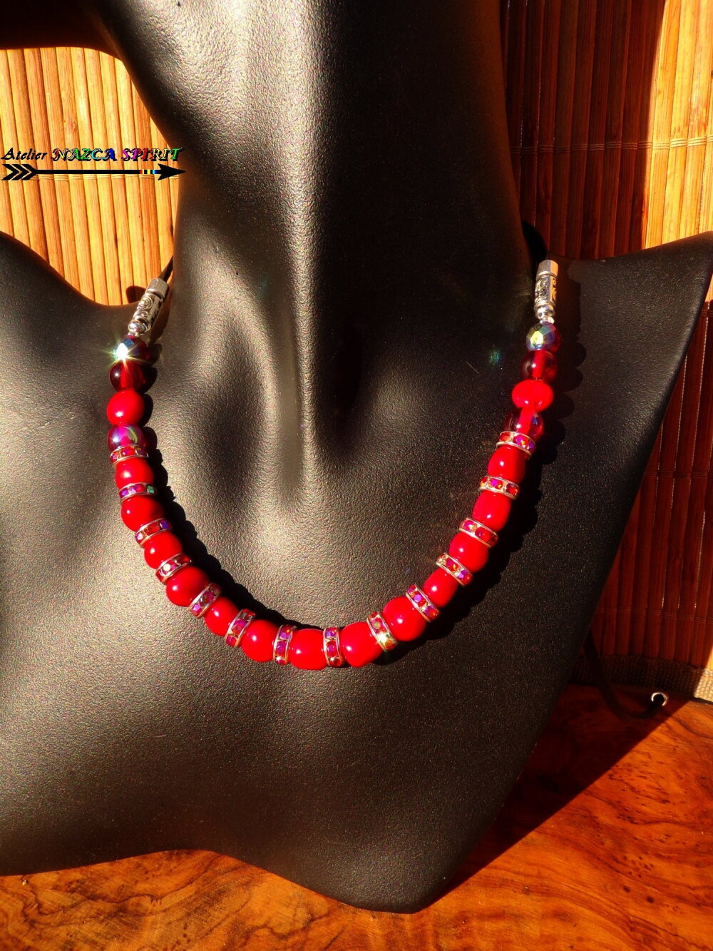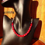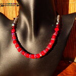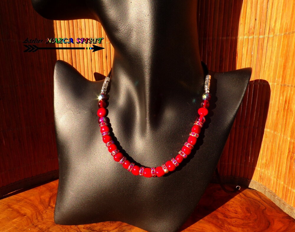 Le collier comprend 15 perles de corail rouge de 8 mm de diamètre, 6 perles en cristal de bohème rouge et grenat de 8 mm de diamètre et de 14 rondelles en cuivre plaqué argent de 8 mm de diamètre agrémentées de cristaux de bohème rouge iridescent.