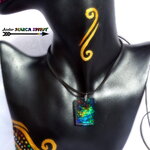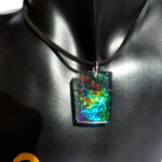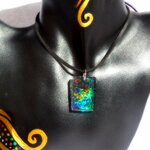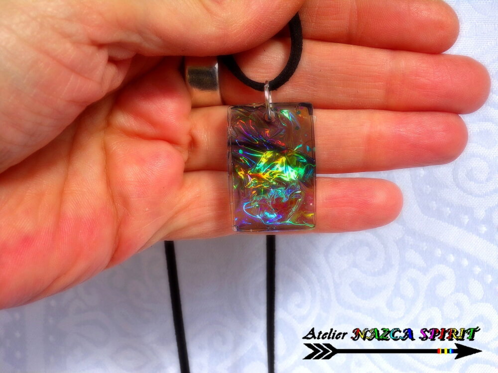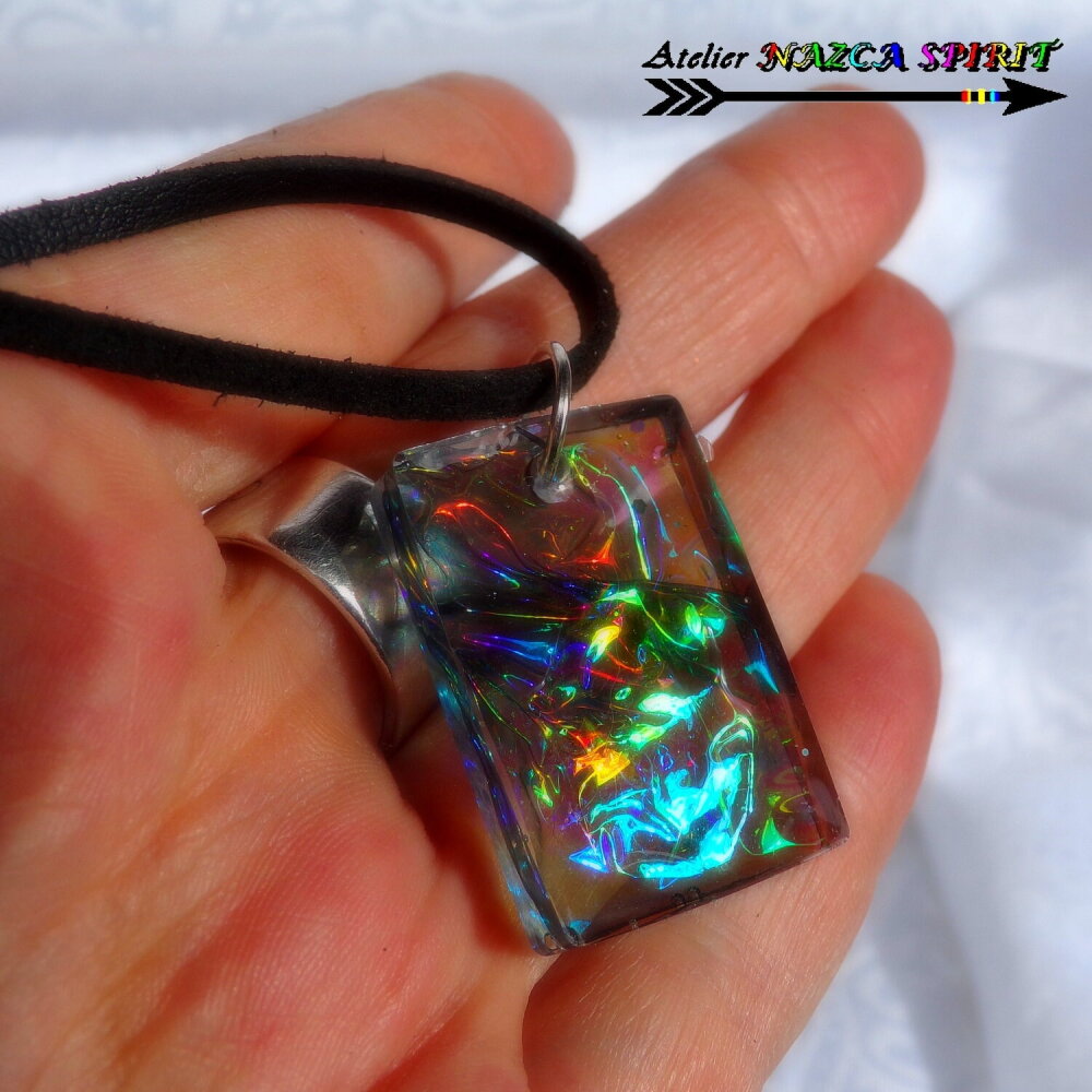 Collier Réglable Bohème Chic / Suédine Effet Cuir / Pendentif Handmade / Rectangle Résine / Multicolore Iridescent /Effet Opale Noire Australienne