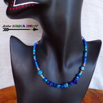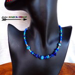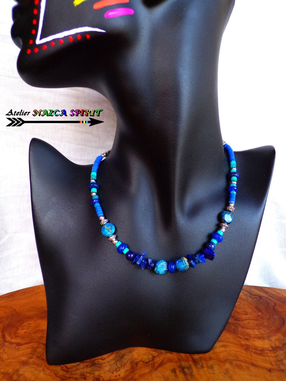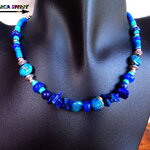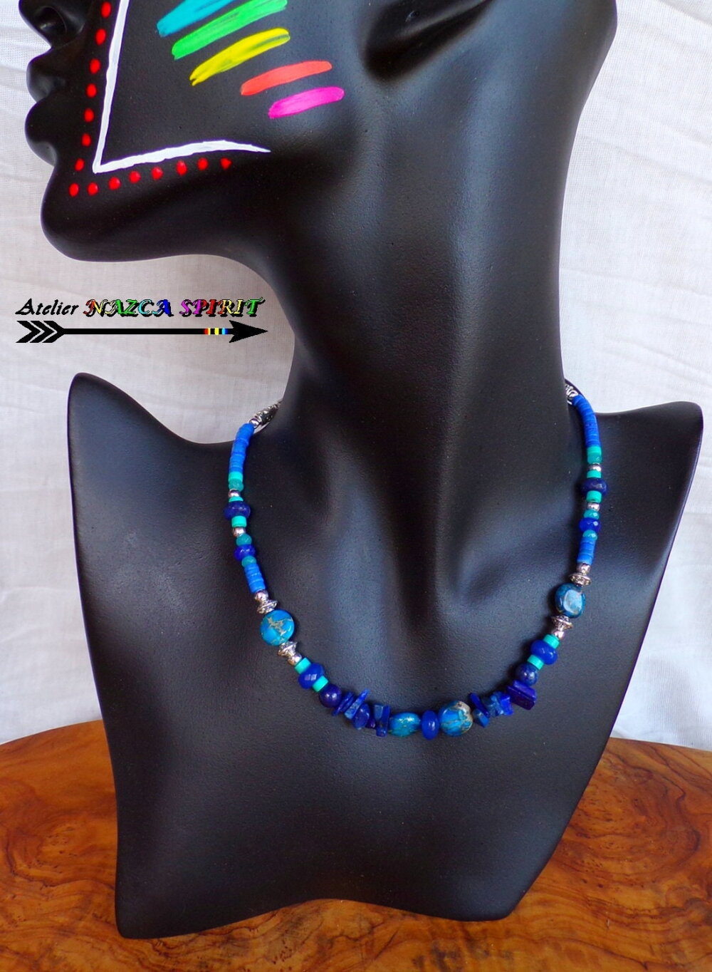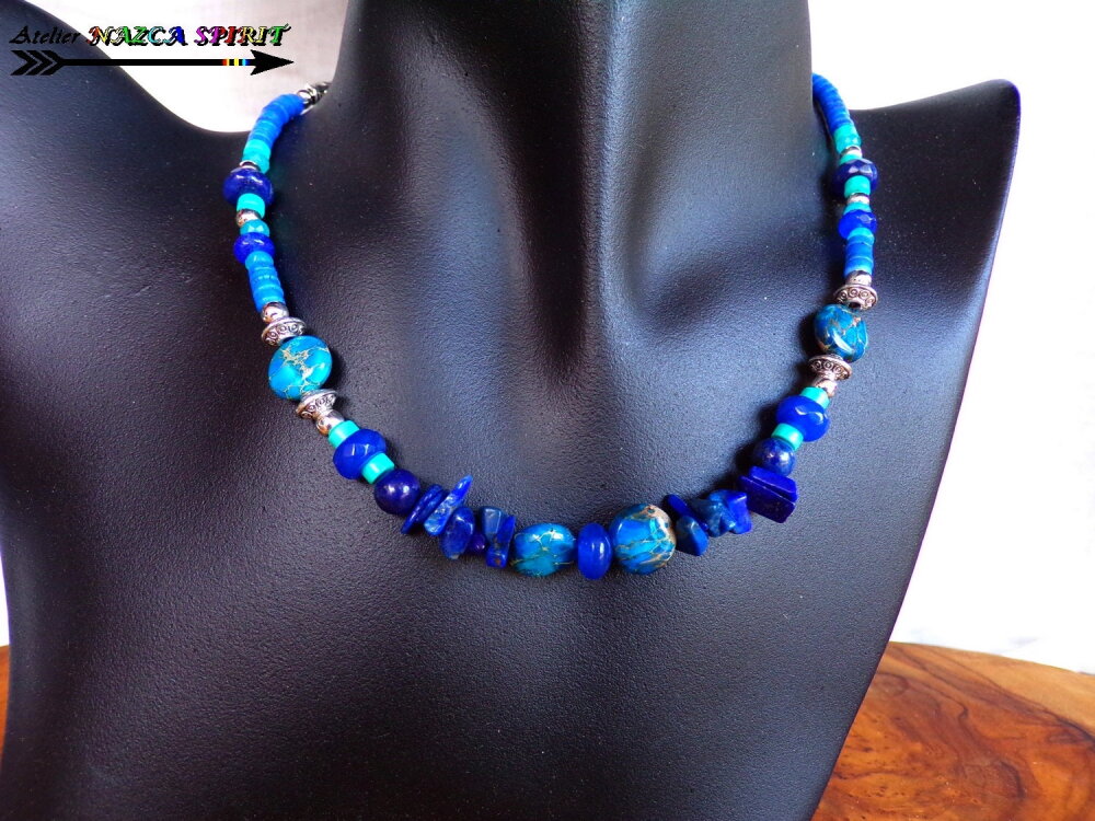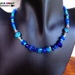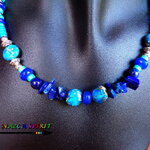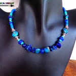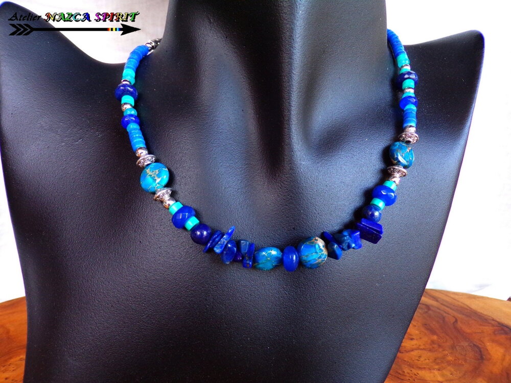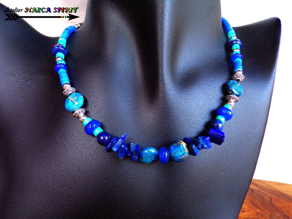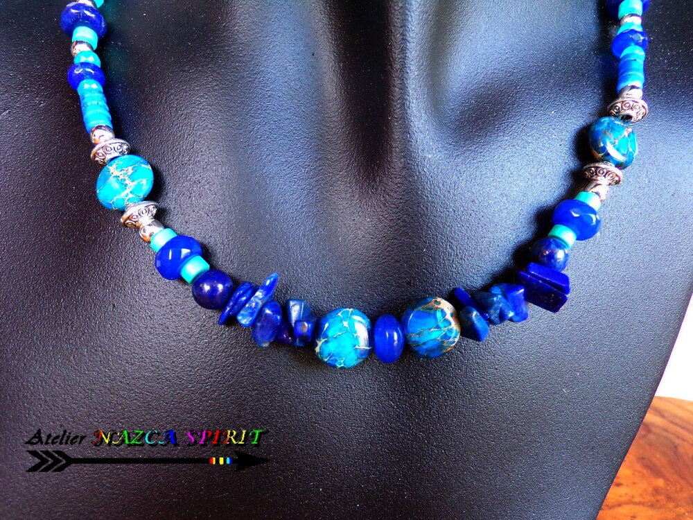 Les égyptiens de l'Egypte antique utilisaient abondamment les pierres en lapis lazuli et un grand nombre d'autres pierres fines et précieuses pour la fabrication de leurs bijoux, objets d'art décoratif et pour la réalisation de leurs cosmétiques. Ici j'ai voulu créer un collier réglable uniquement réalisé à partir de pierres fines bleues (lapis lazuli, jaspe aquaterra bleu turquoise, apatites et perles en howlite bleu cobalt) et pierres précieuses (saphir bleu).
