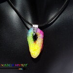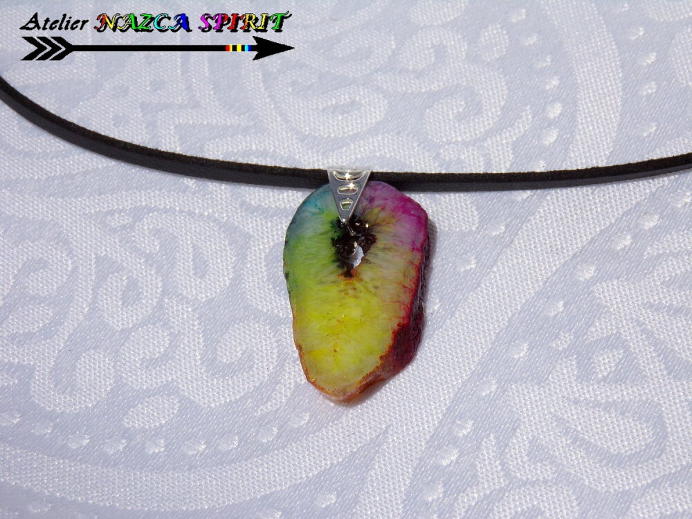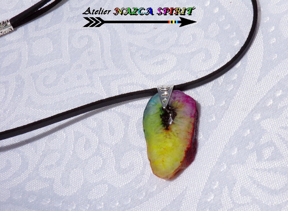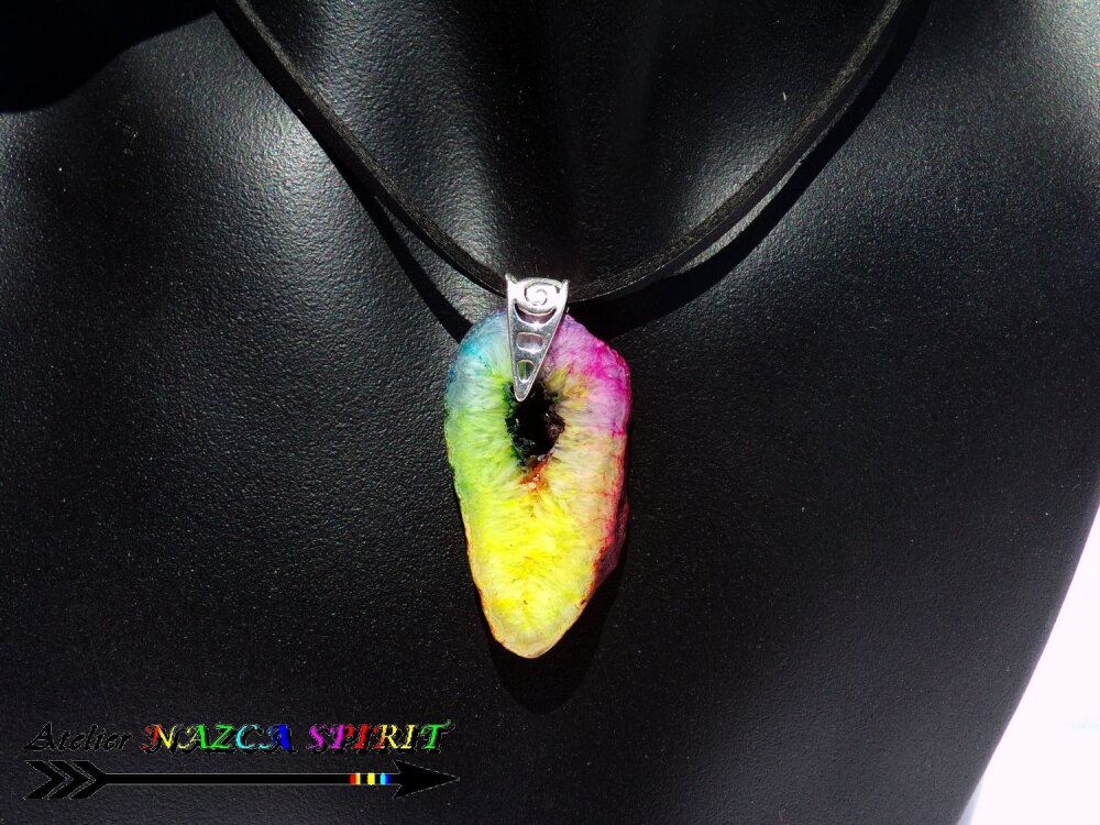 Collier Réglable / Esprit Ethnique / Bélière Argent 925 / Pendentif Bohème / Géode Solar Quartz / Tranche de Cristal Teinté / Multicolore.