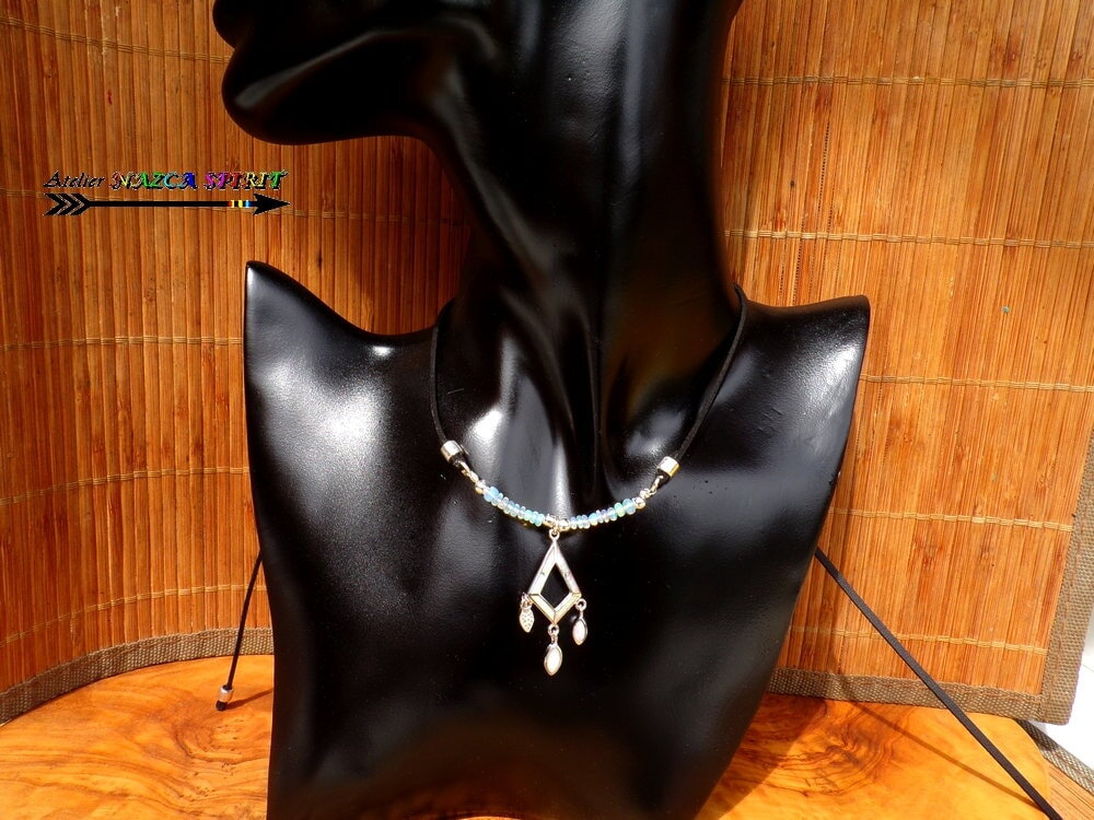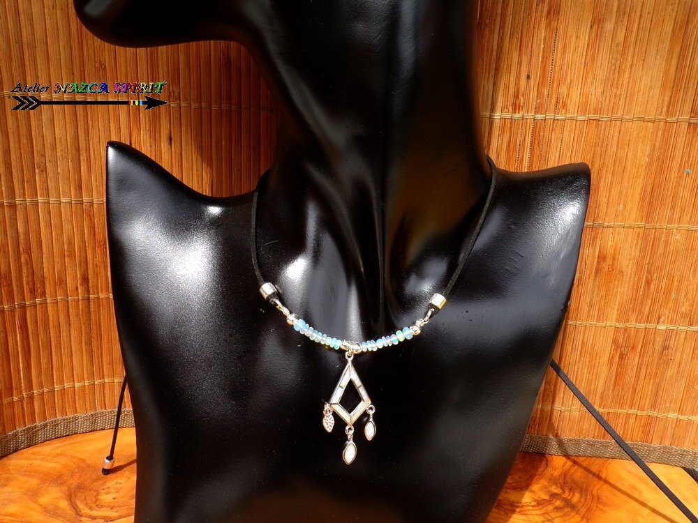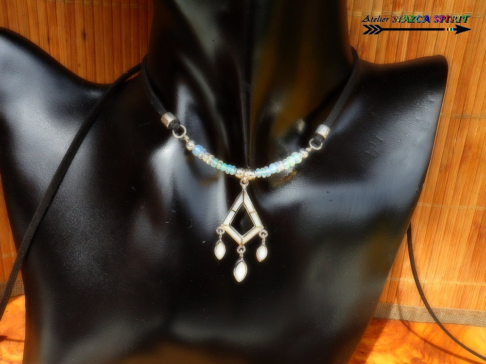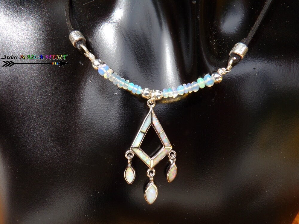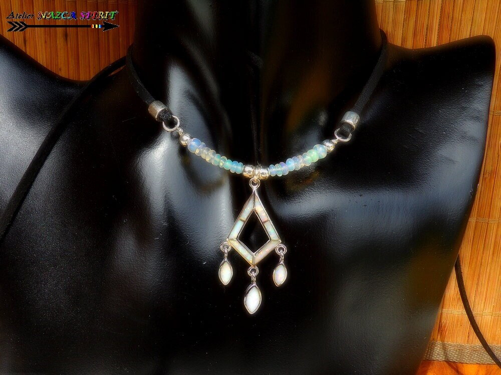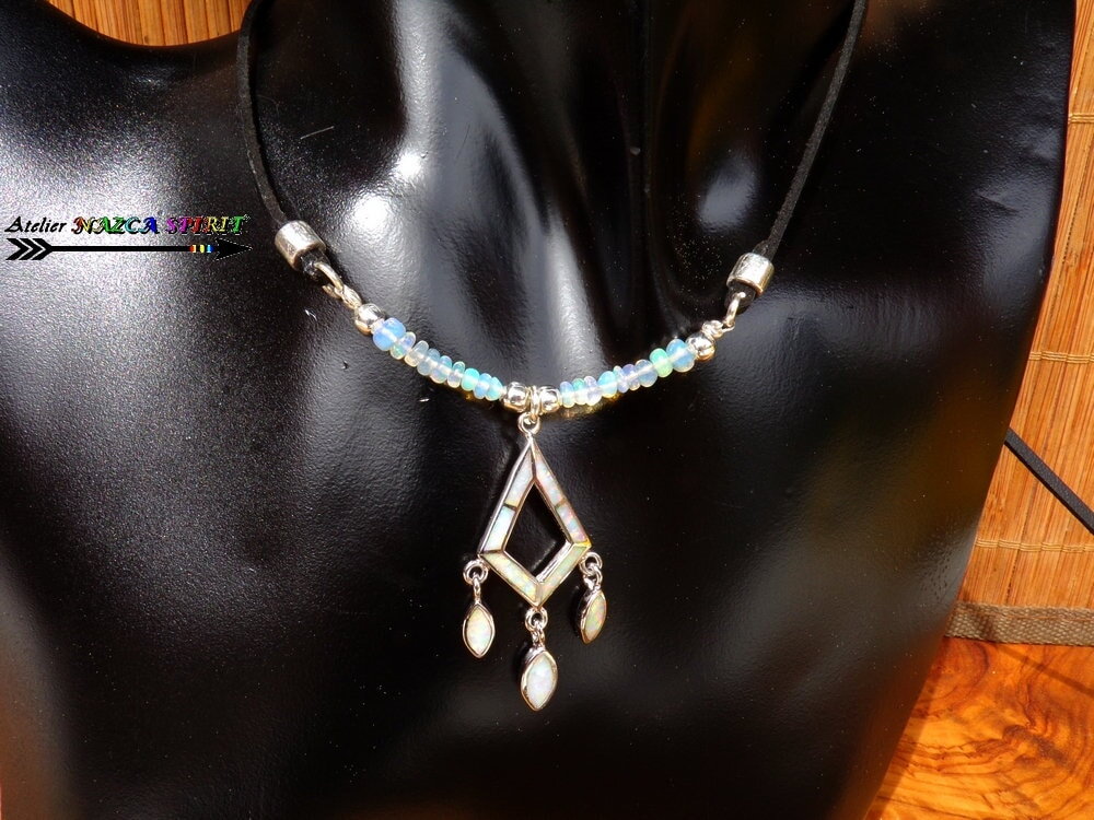 Matériaux : plaqué argent, opales d'Australie, suédine, alliage tibétain, fil acier gainé