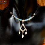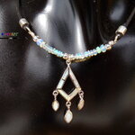 J'ai réalisé ce collier très original à partir de 18 superbes perles roues en véritable opale australiennes très lumineuses (qualité AAA) montées sur un câble très résistant en acier gainé. J'ai ensuite relié au tour de cou, un superbe pendentif au formes géométriques en cuivre plaqué argent serti de superbes opales australiennes iridescentes.