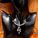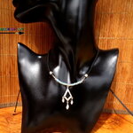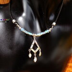 Grâce à un procédé que j'ai mis au point, vous pourrez adapter le collier à votre tour de cou et le porter soit mi-long soit en ras de cou. Ce système d'auto réglage a été réalisé à partir de lacet suédine noir effet cuir et d'une perle tube ciselée en alliage tibétain (sur la dernière photo vos pouvez voir le système de serrage)
