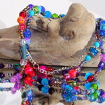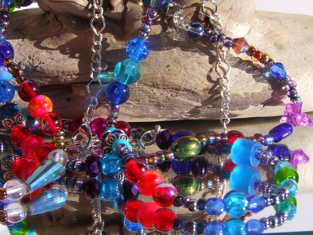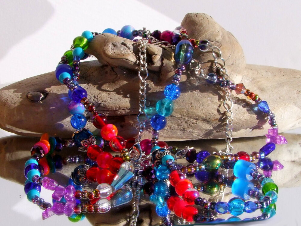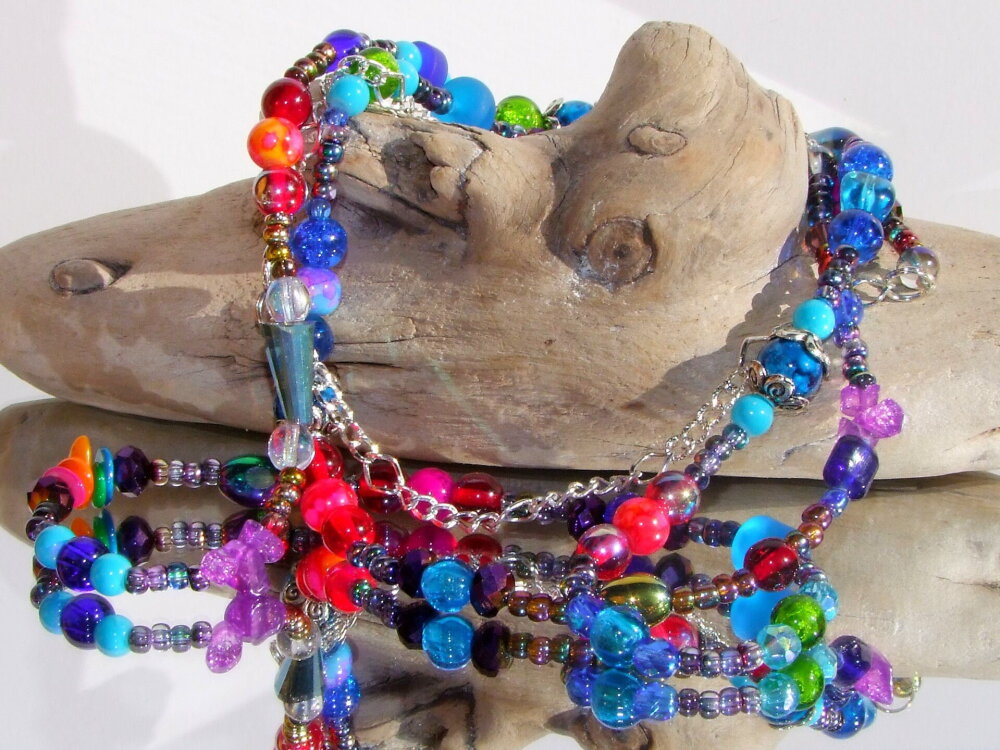 Collier artisanal inspiration bohème chic Multicolore Made in Provence intégralement réalisé à la main à partir de perles en Verre Italien, de perles en Cristal Tchèque, rocailles en verre de bohème et de perles rondes en cristal de Bohème agrémenté d'une chaîne en cuivre plaqué argent.