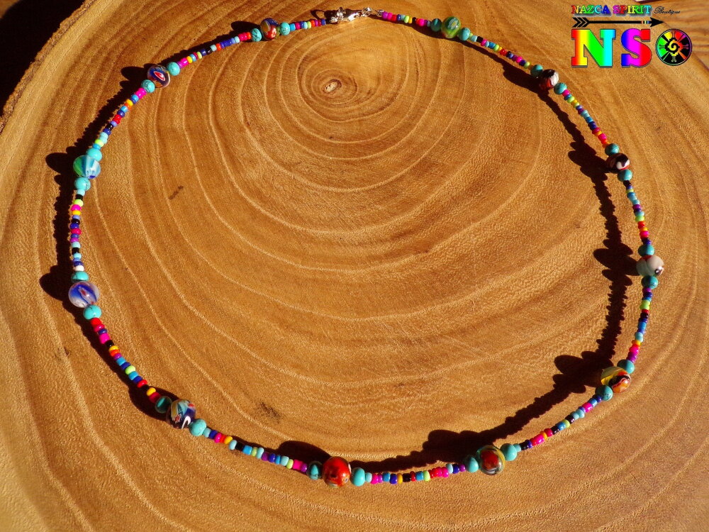 Collier Tribal Africain Fait Main 55 cm ("21.65) de long - Perles de rocaille en verre - Perles rondes verre de Venise Milfiori Multicolore