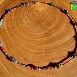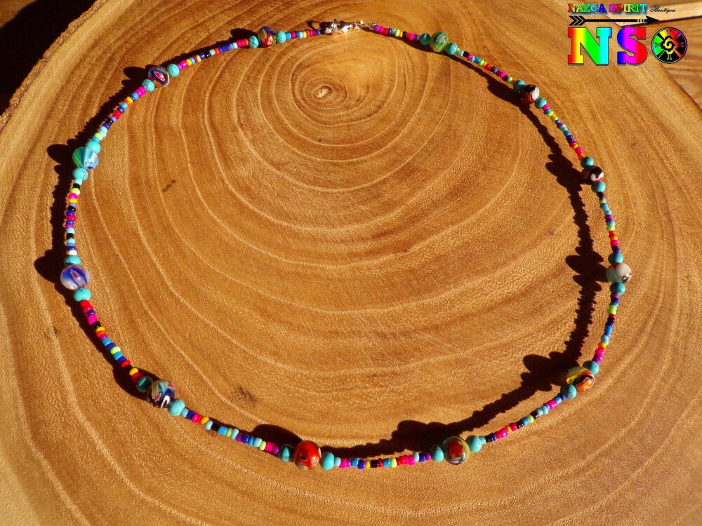 Je vous propose de découvrir une de mes dernières créations. Il s'agit d'un collier tribal inspiré des bijoux africains réalisé à partir d'un câble en acier gainé sur lequel j'ai enfilé des perles de rocaille multicolore (couleurs aléatoires), de superbes perles rondes de 8 mm de diamètre en verre Milfiori de Venise (perles de différentes couleurs) et des petites perles rondes en véritable turquoise naturelle.