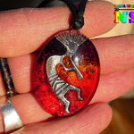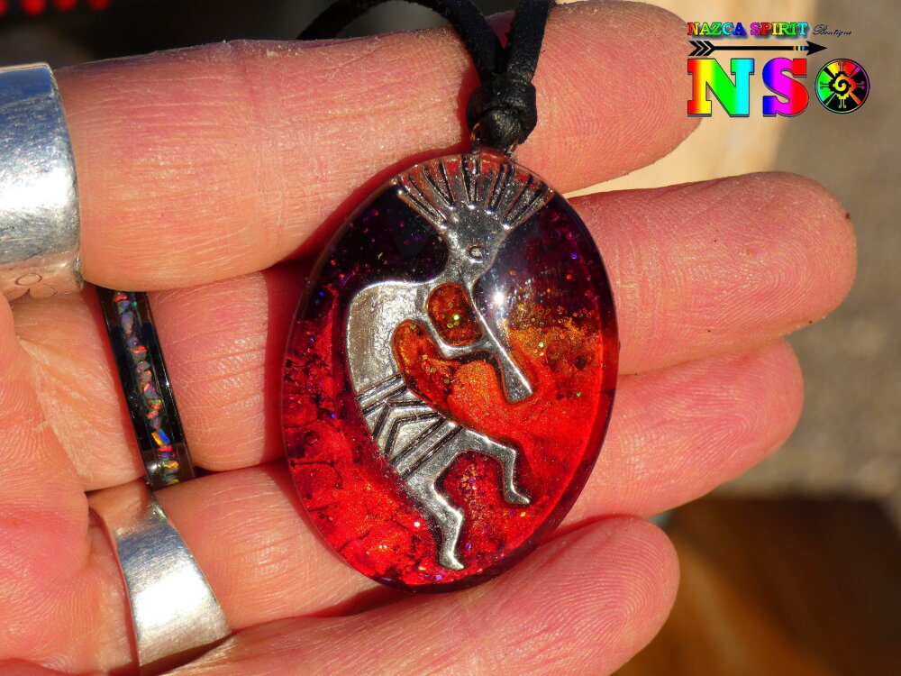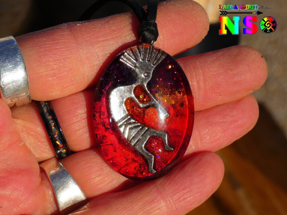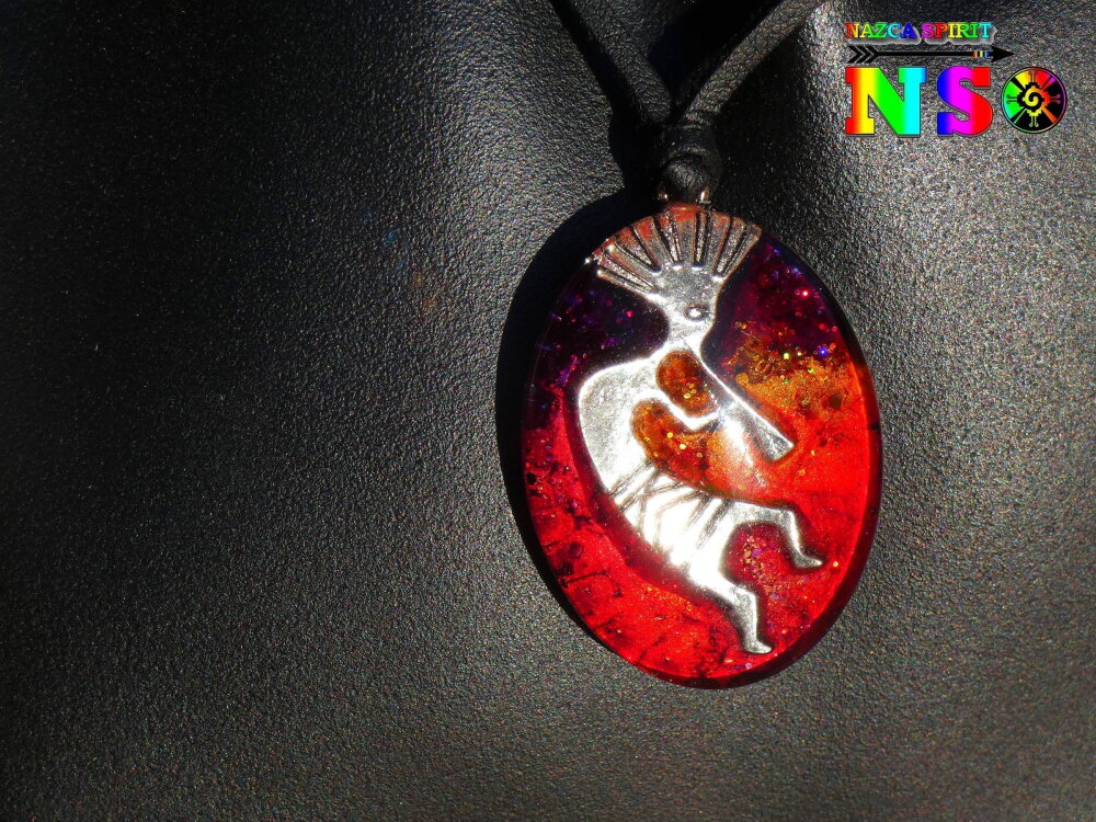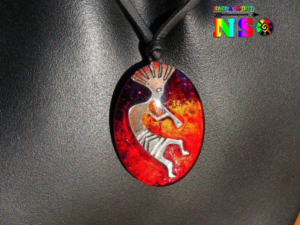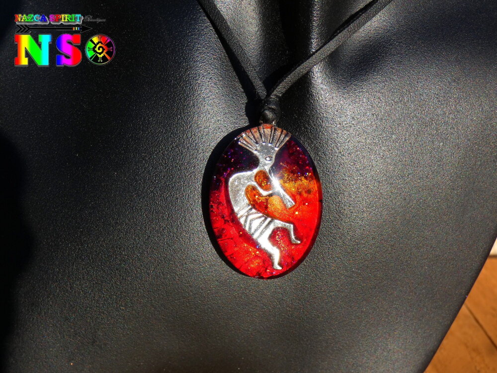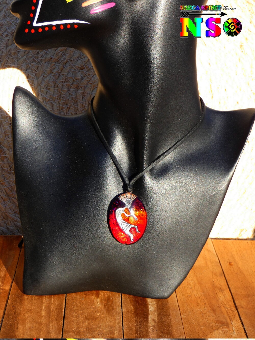Collier amérindien ajustable - Pendentif artisanal fait main Kokopelli- Verre ovale multicolore iridescent -Bijou ethnique - Création unique