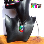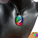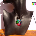 Grâce à ma technique de coloration du verre, les couleurs du pendentif évoluent en fonction de son orientation sous la lumière solaire ou artificielle.