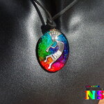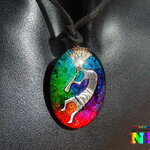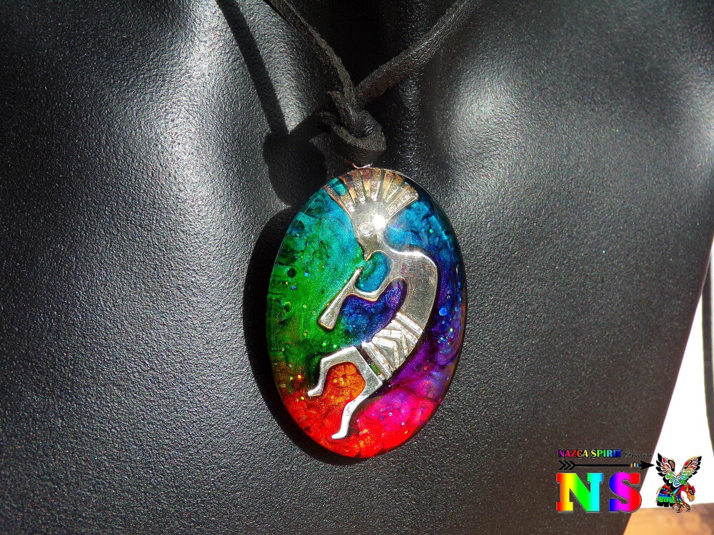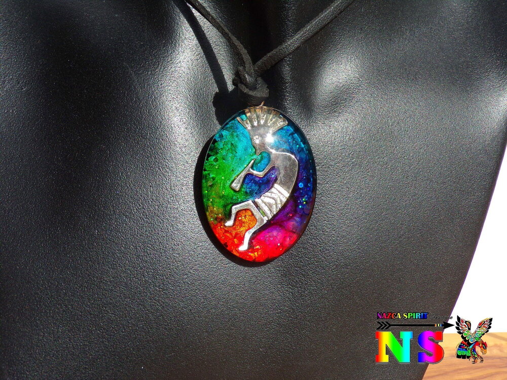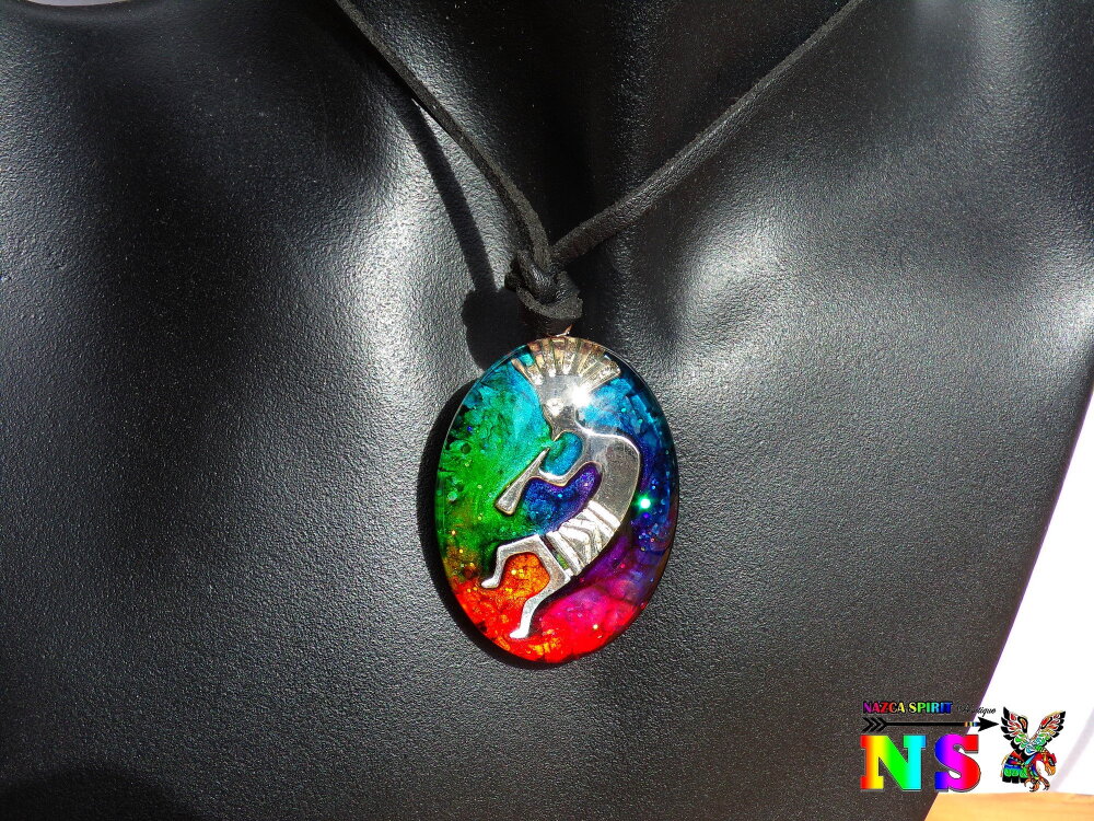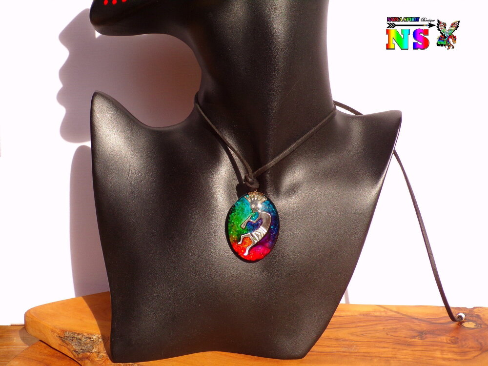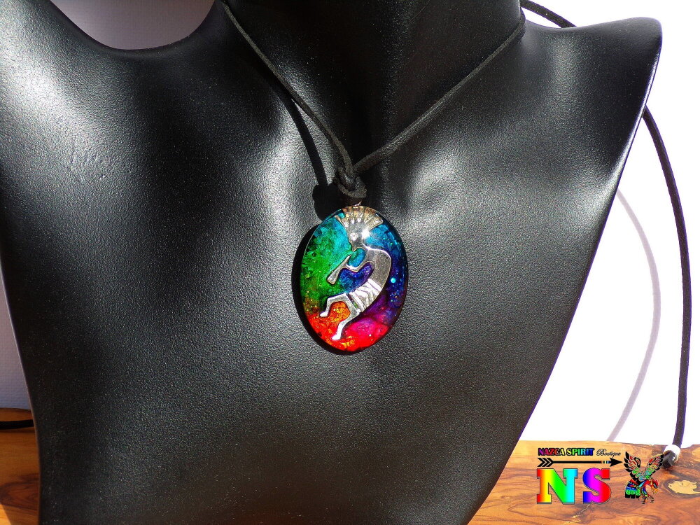 Collier Tribal Ethnique Ajustable, Pendentif Artisanal Fait Main, Verre Ovale Kokopelli Multicolore Iridescent, Bijou Artisanal Unique