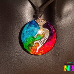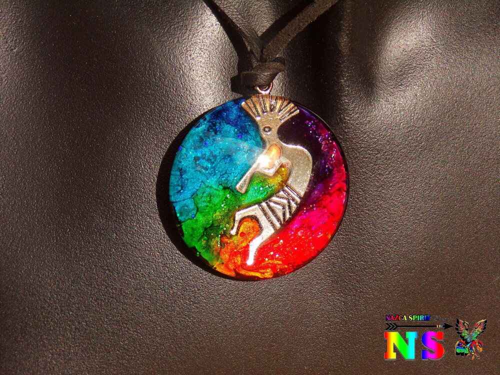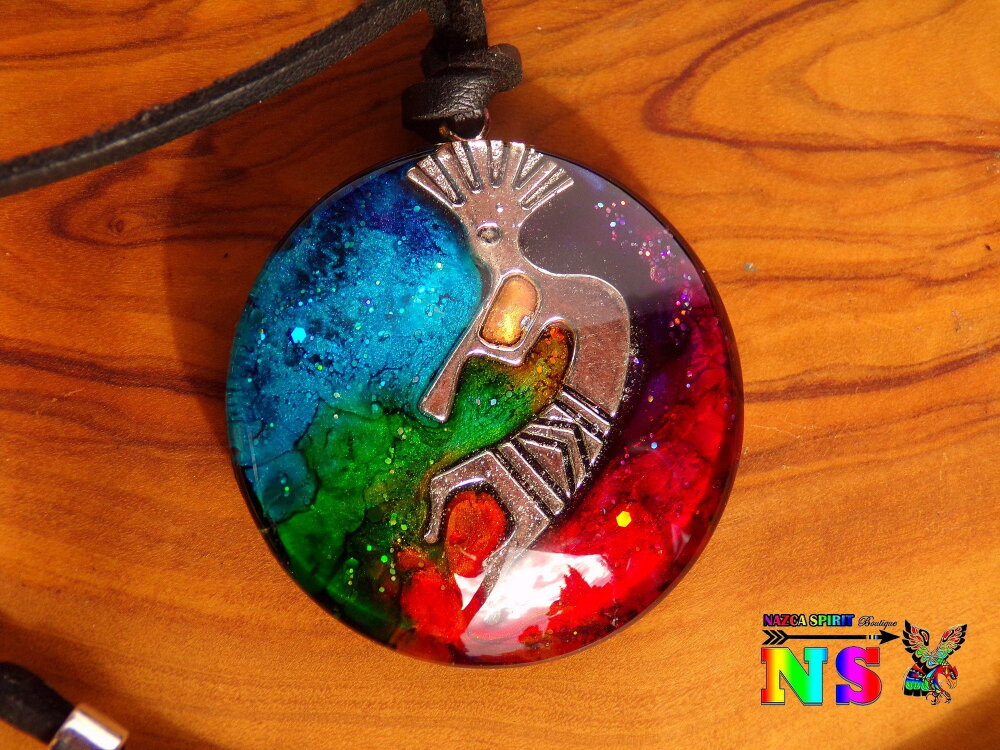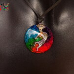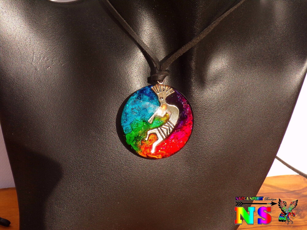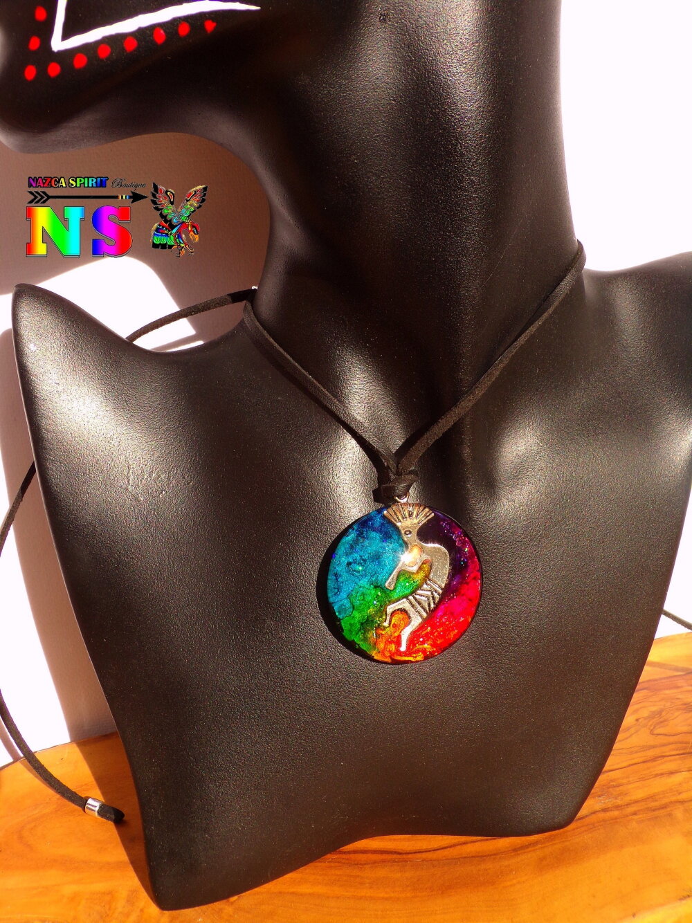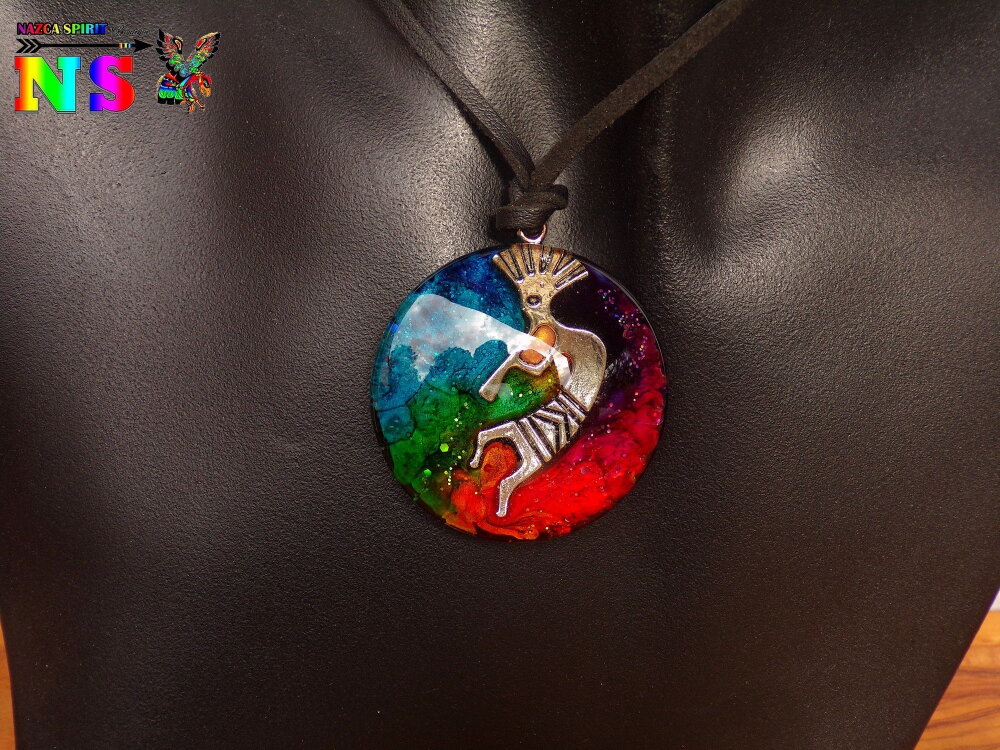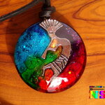 Le pendentif est en verre bombé coloré à la main grâce à un procédé de coloration mis au point par l'Atelier Nazca Spirit et breveté auprès de l'INPI (Institut National de la Protection Industriel) qui est un organisme gouvernemental protégeant les innovations techniques.