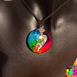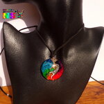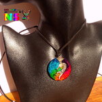 Grâce à ma technique de coloration du verre, les couleurs du pendentif évoluent en fonction de son orientation sous la lumière solaire ou artificielle.