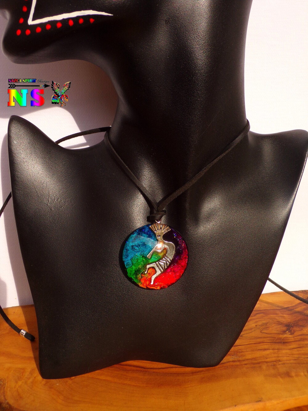 Collier amérindien ajustable - Pendentif artisanal fait main - Verre ovale multicolore iridescent -Bijou ethnique - Création unique.