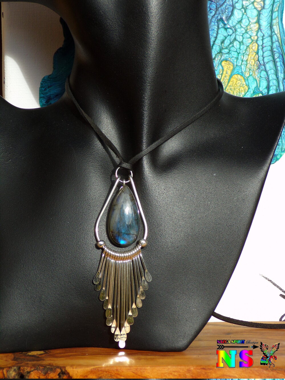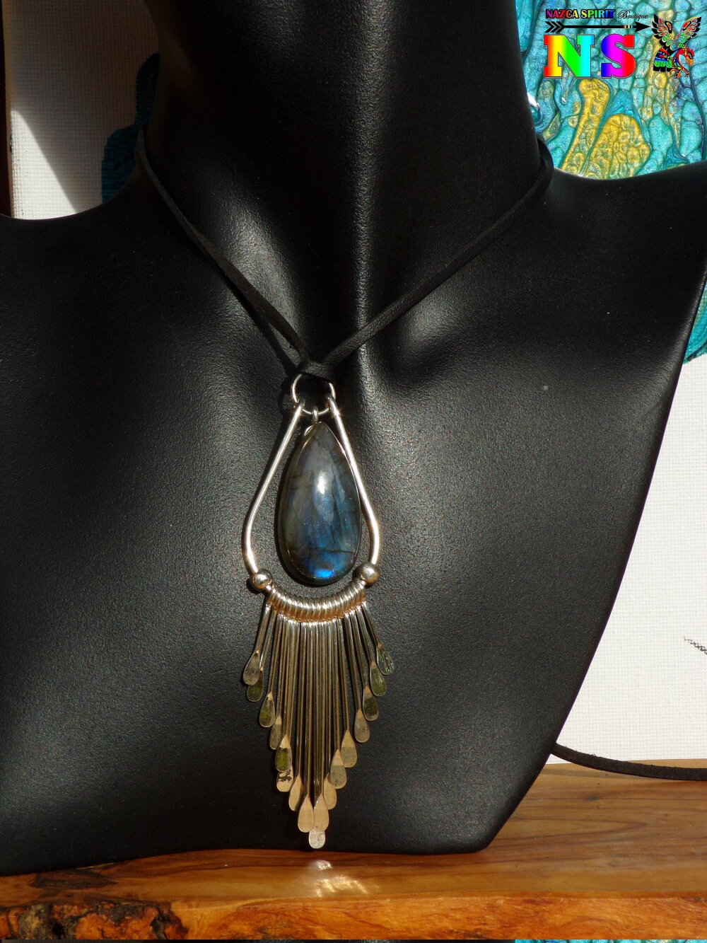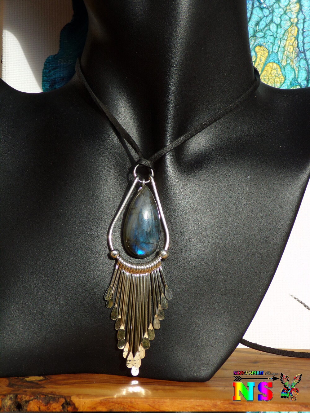 Matériaux : cuivre plaqué argent, pierre fine labradorite bleue (origine : Pérou), daim suédé effet cuir, perles ciselées en alliage tibétain