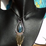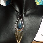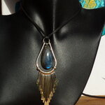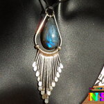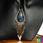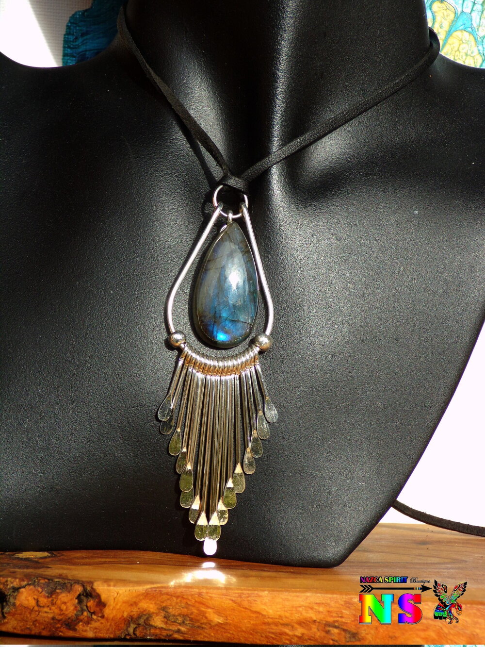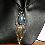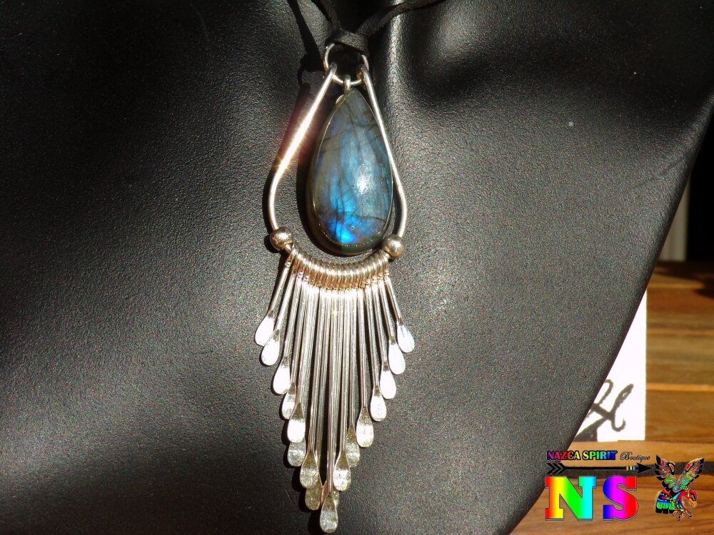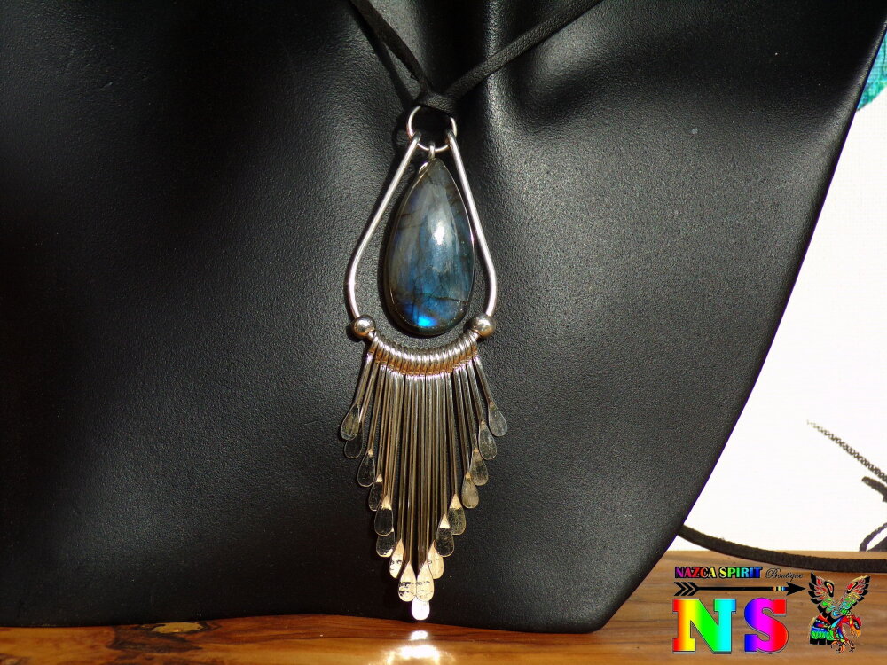 Matériaux : cuivre plaqué argent, pierre fine labradorite bleue (origine : Pérou), daim suédé effet cuir, perles ciselées en alliage tibétain