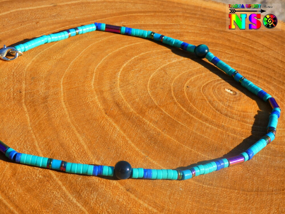 J'ai réalisé ce collier ras de cou inspiré des bijoux Navajo à partir d'anneaux doubles sécurisés, d'un fil câblé en acier gainé, de perles en turquoise naturelle, de perles tubes en Howlite teintée turquoise et bleu marine, de perles tubes et rondelles en hématite multicolore et de perles rondes en oeil de tigre bleu turquoise foncé.