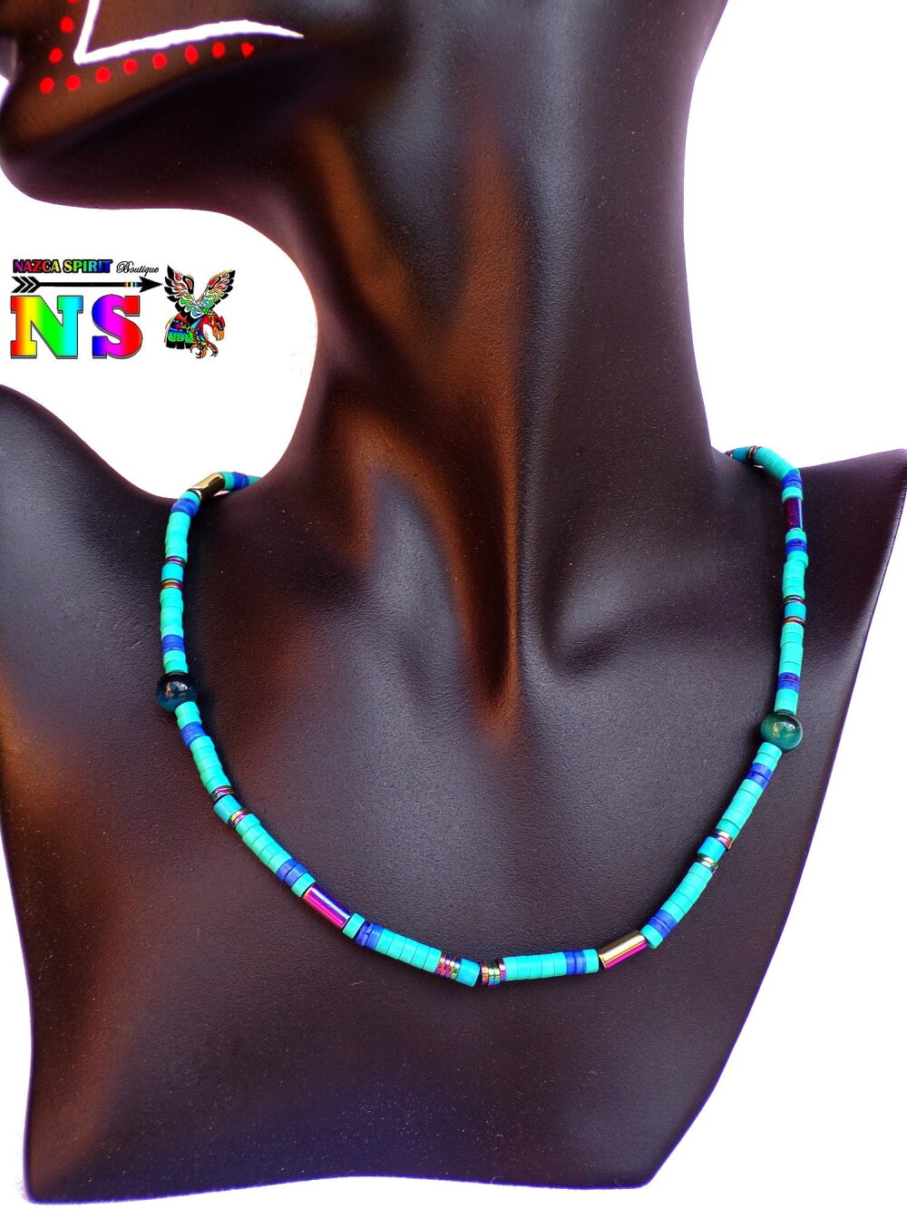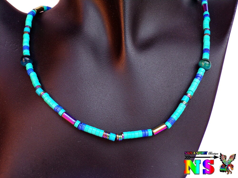 Collier Native American - Bijou Navajo - Artisanat Amérindien - Oeil de Tigre Turquoise-Turquoises USA -Howlite Bleue - Hématite Multicolore.
