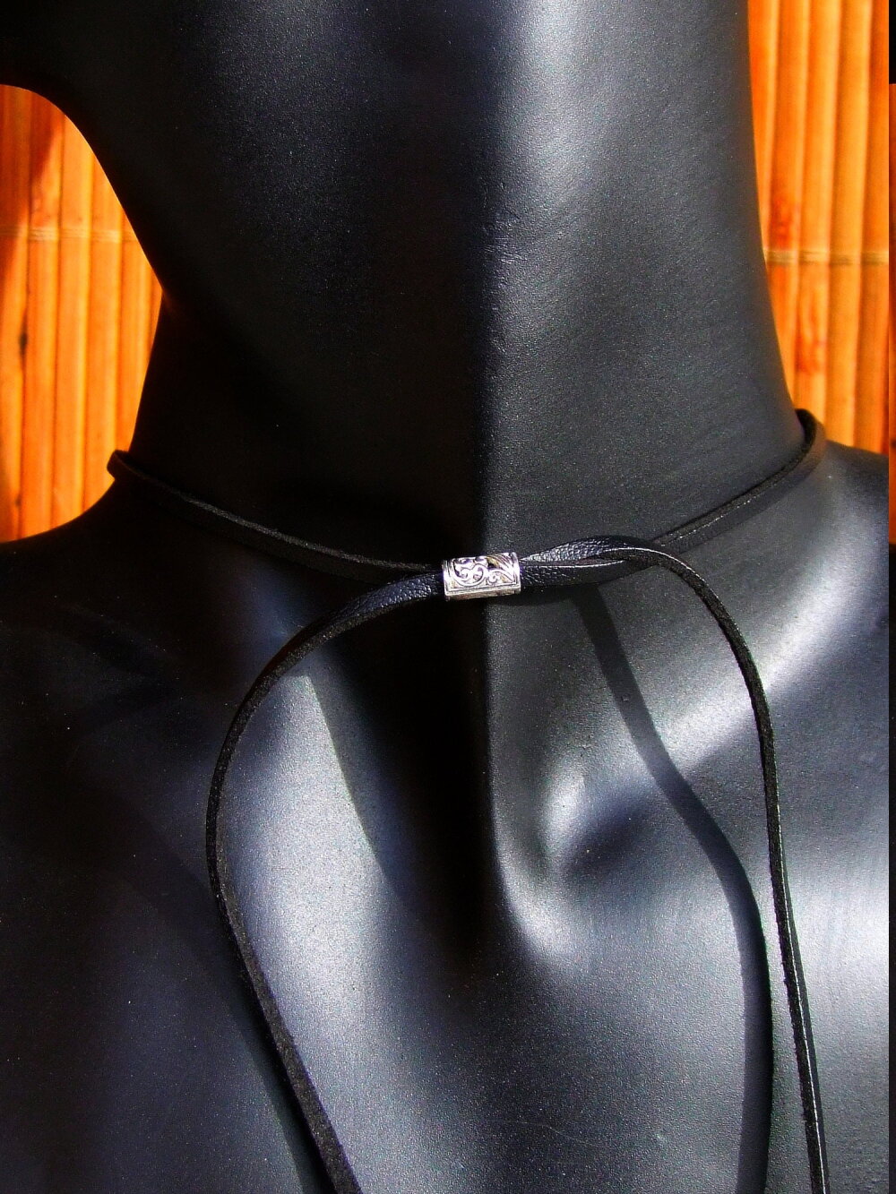 Grâce à un procédé que j'ai mis au point, vous pourrez adapter le collier à votre tour de cou. Ce système d'auto réglage a été réalisé à partir de lacet suédine noir effet cuir et d'une perle tube ciselée en alliage tibétain (sur la dernière photo vos pouvez voir le système de serrage)