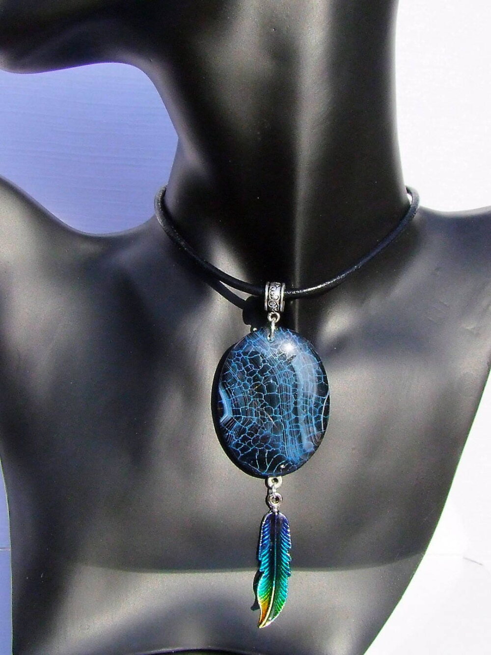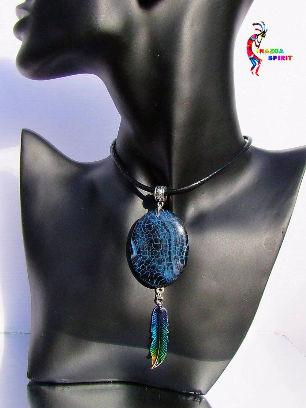 Collier Tribal Ethnique Tour de Cou en Cuir, Pendentif Artisanal Agate Bleue, Serpent Ciselé et Plume Métal Emaillée Bleu Turquoise