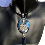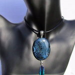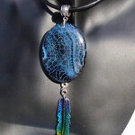 J'ai ensuite relié au bout du palet d'agate, une plume en alliage tibétain que j'ai émaillé moi-même côté recto et verso dans des tons de bleu cobalt, bleu turquoise et vert émeraude.