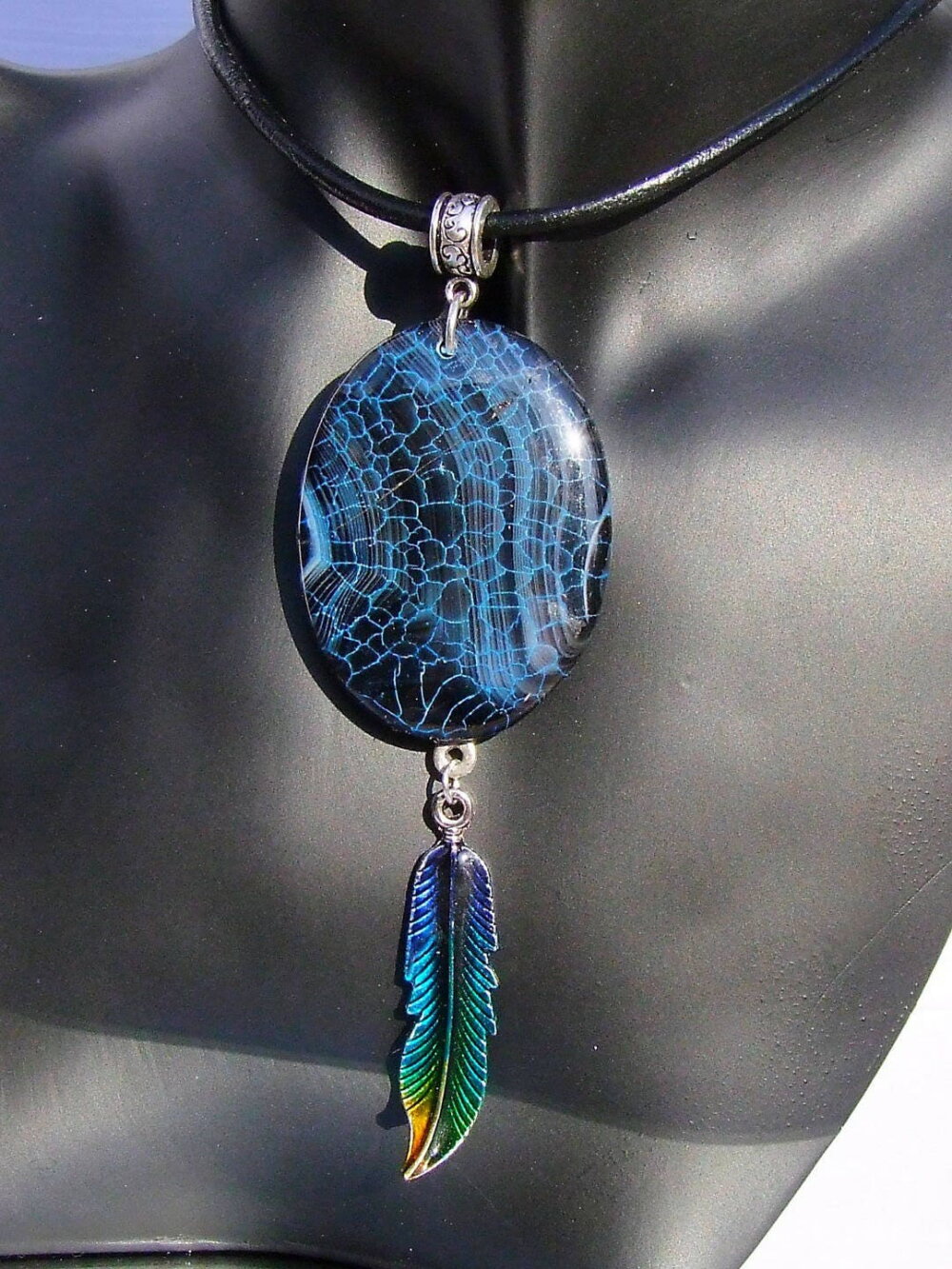 Collier Amérindien Ras de Cou en Cuir et Pendentif Artisanal en Agate Blue Fire Serpent Argent et Plume Emaillée baptisé "Indian Storm"