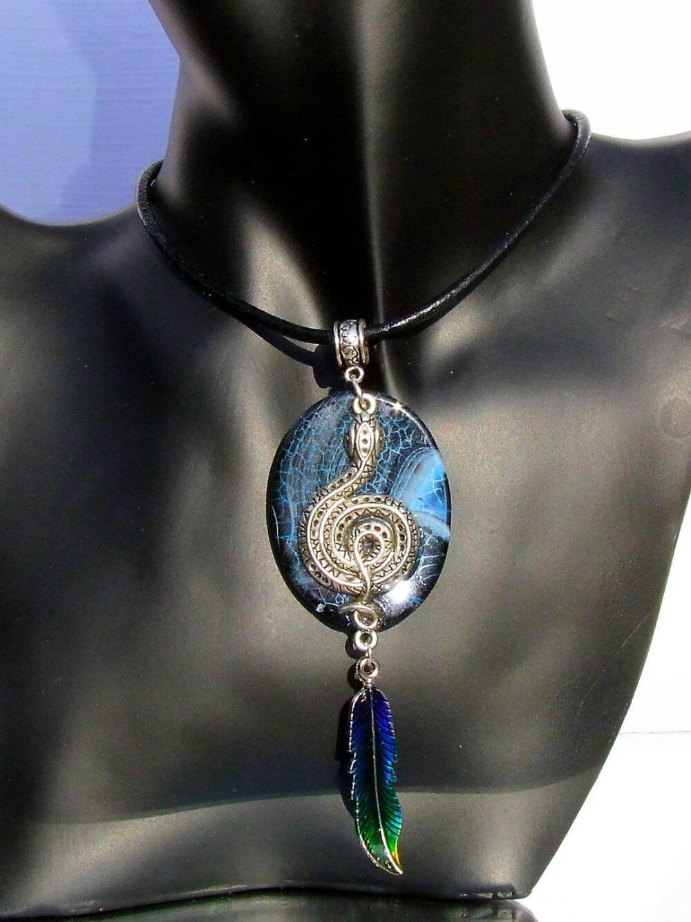 Collier Amérindien - Tour de Cou en Cuir - Pendentif Artisanal Agate Bleue - Pendant Serpent Ciselé et Plume Emaillée Bleu Turquoise