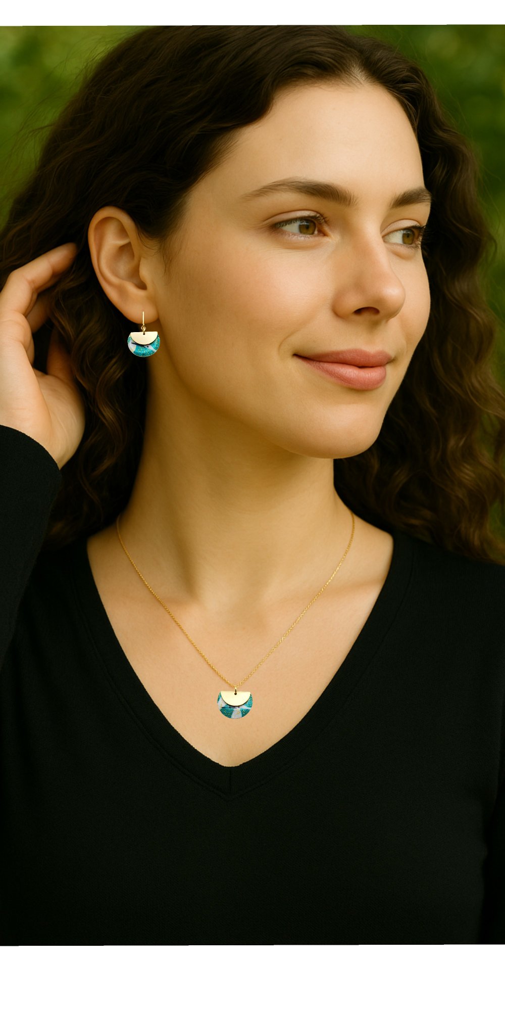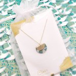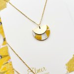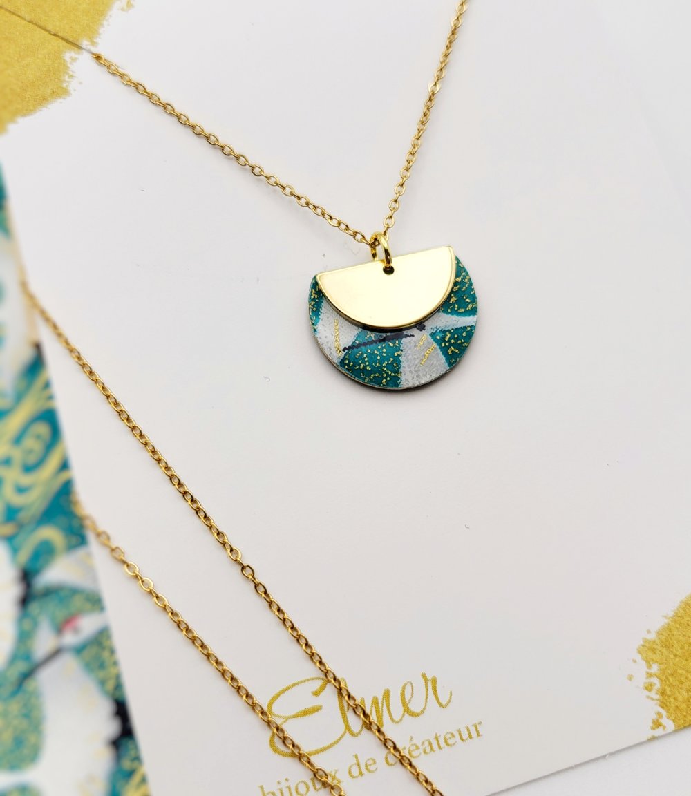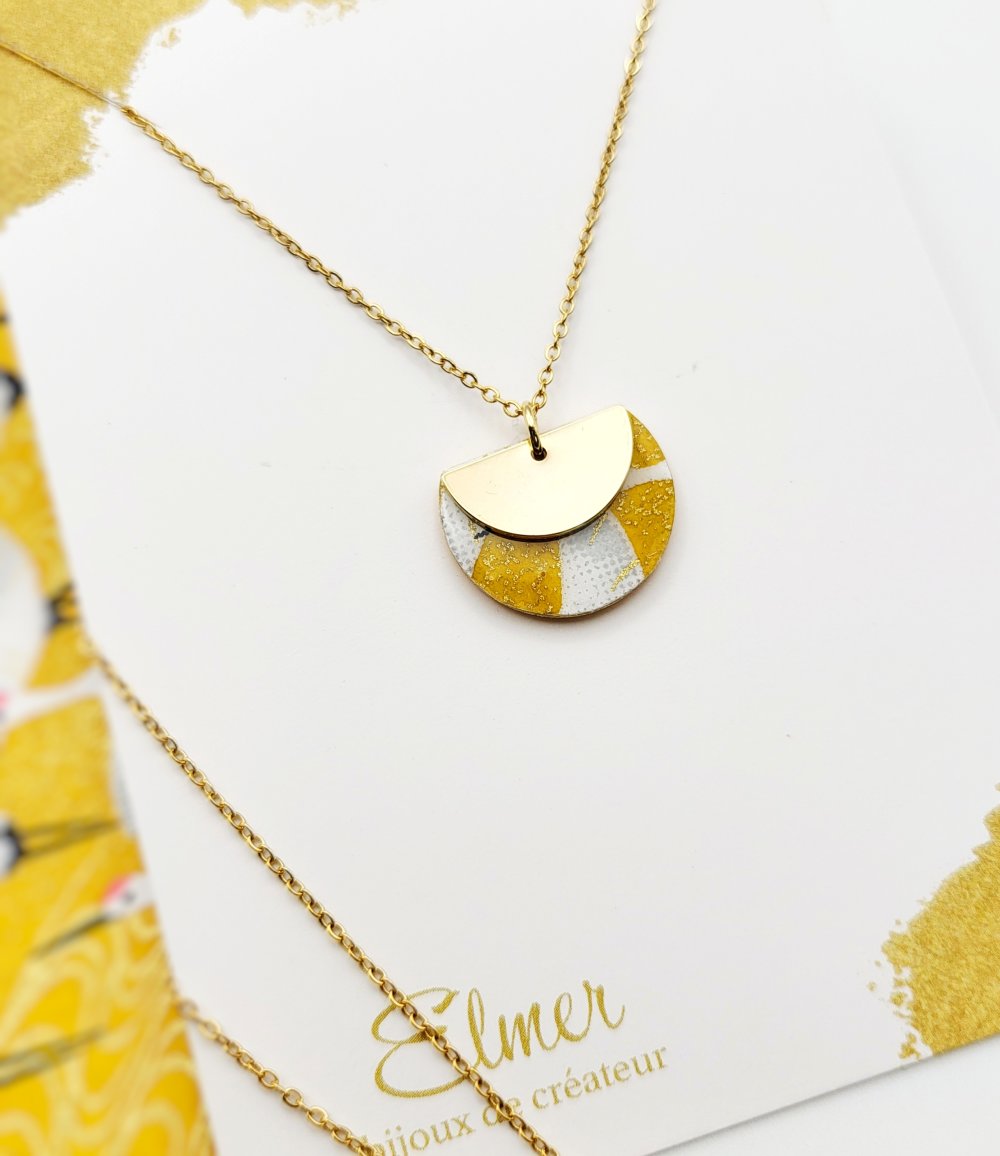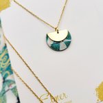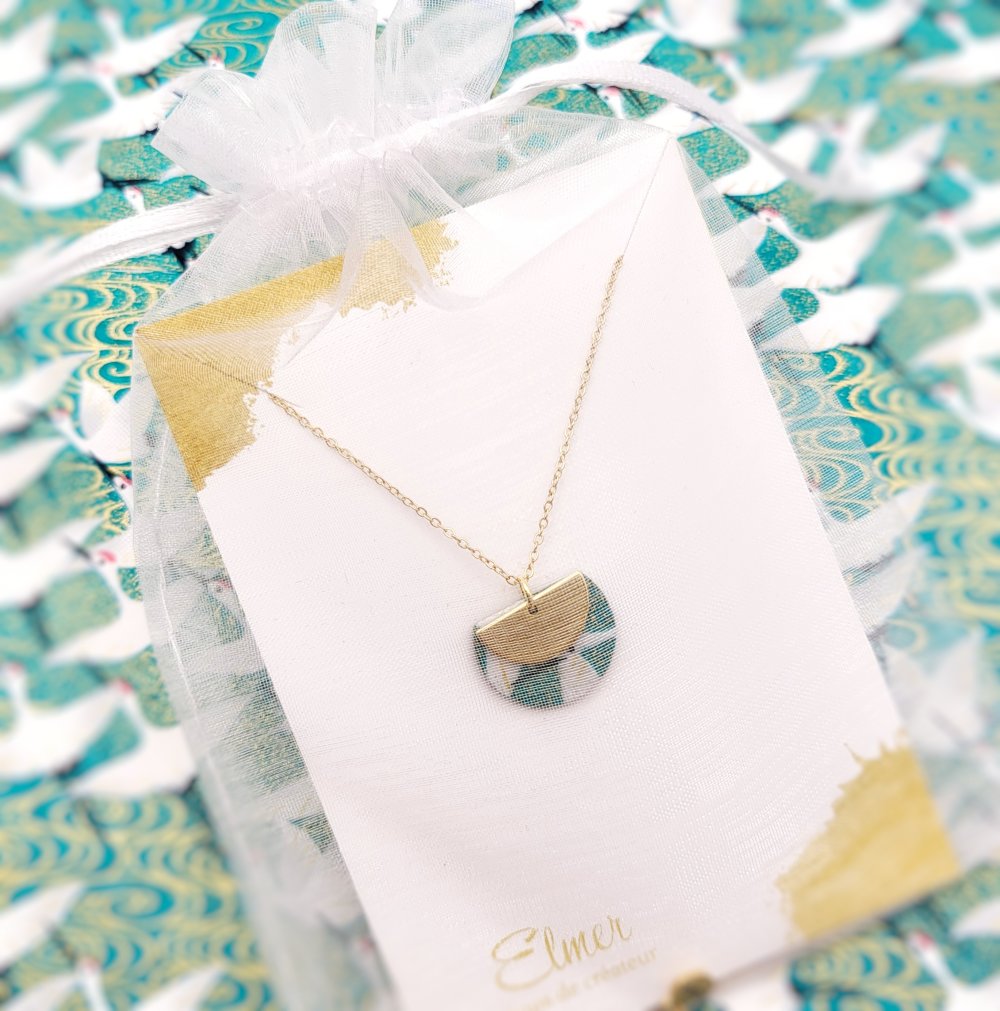 🌸✨ Le collier court BOTO 🌸✨ en acier inoxydable doré séduit par son pendentif en demi-cercle de papier washi japonais, protégé par une fine résine et orné d’une petite pampille dorée lisse.