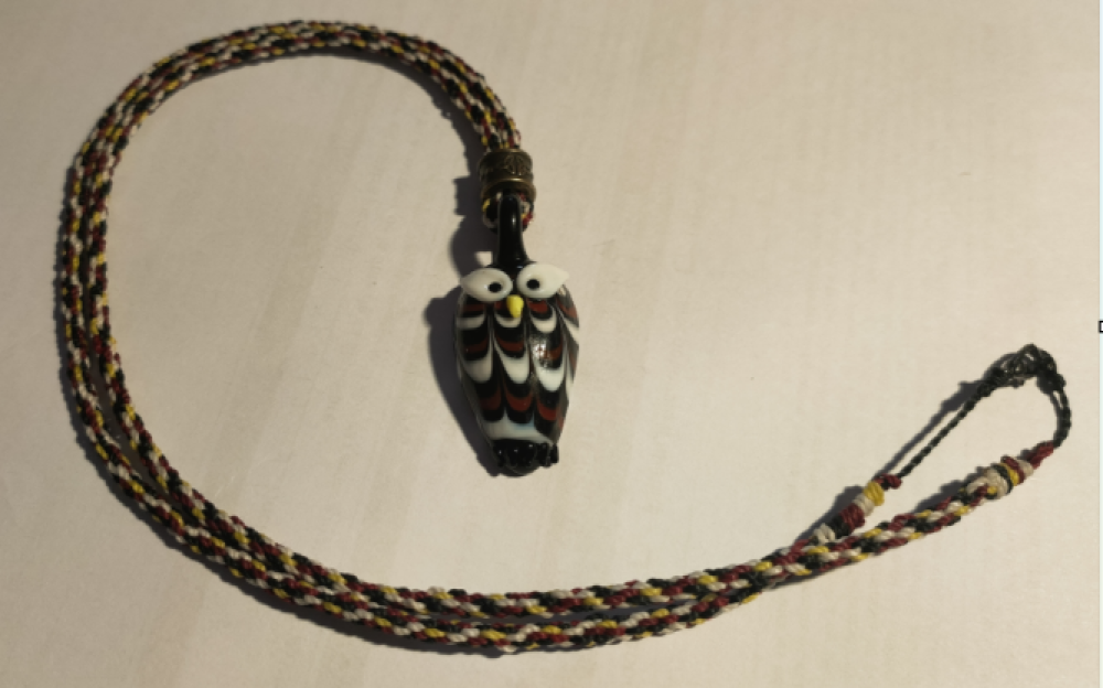 J'ai travaillé autour du pendentif en verre, représentant une chouette ou un hibou. J'aime bien les couleurs et ses grands yeux blancs.