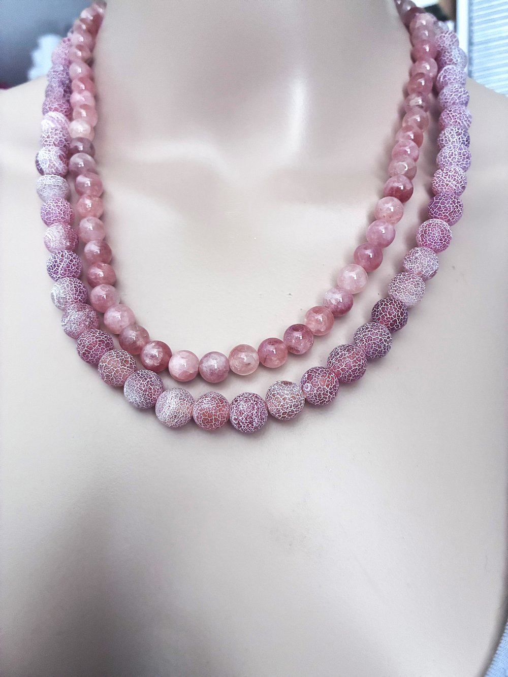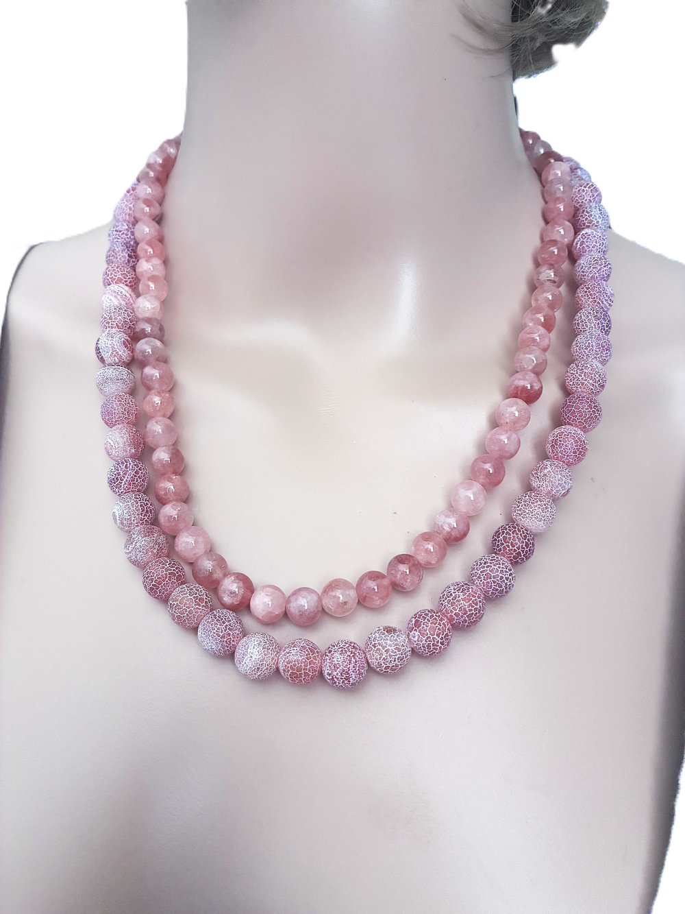 Collier 2 rangs 55 cm Agate veinée rose orangé et agate simple perles de 8mm et 10mm Bijou femme