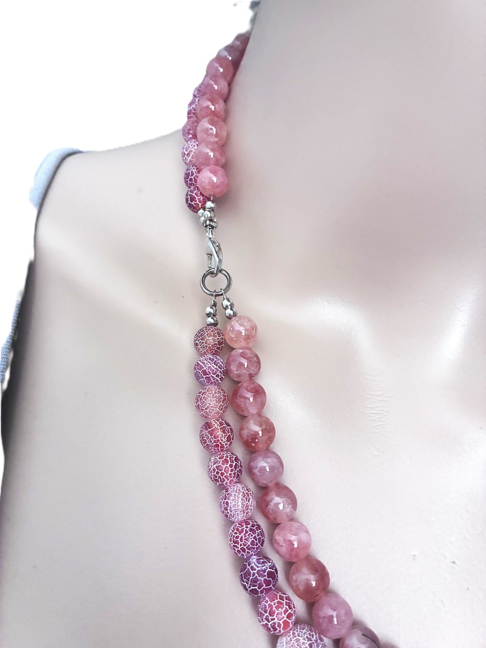 Agate veinée rose orangé mat, perles de 10mm, pour le premier rang, et agate rose orangé, perles de 8mm, pour le deuxième rang.