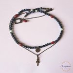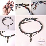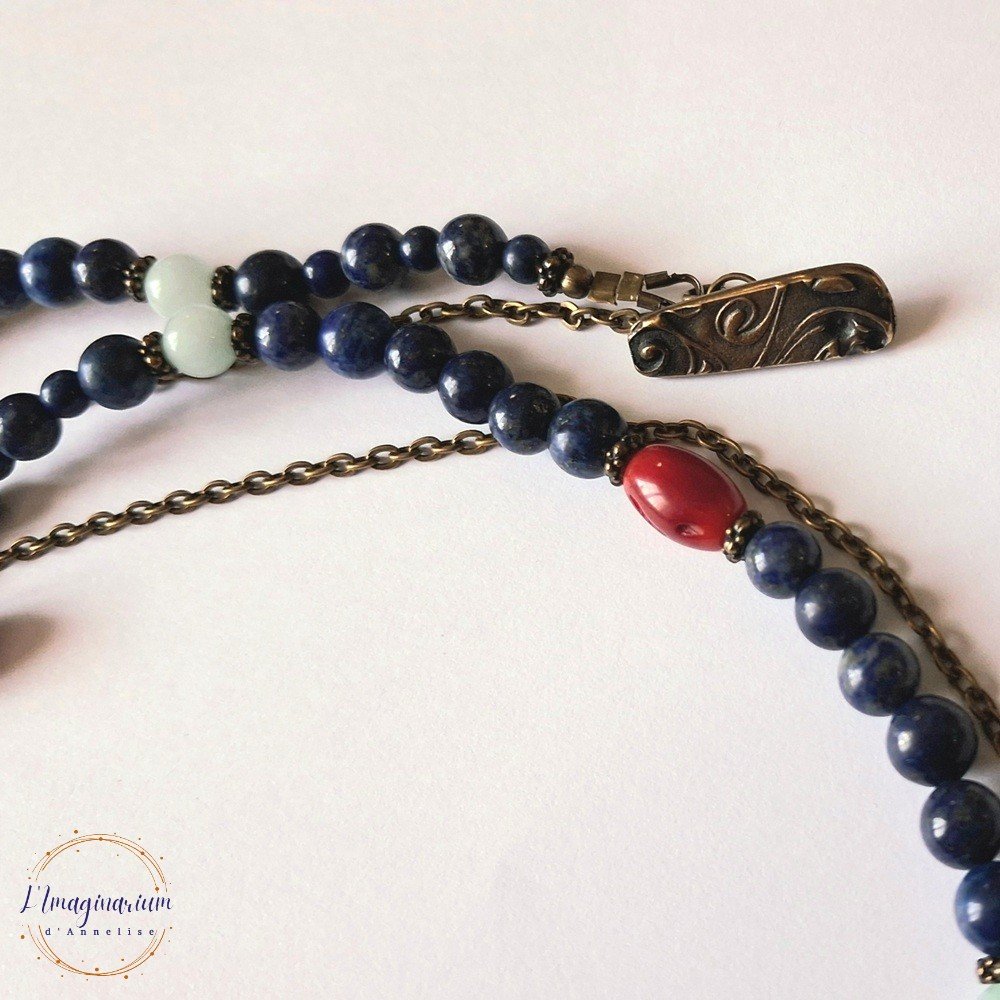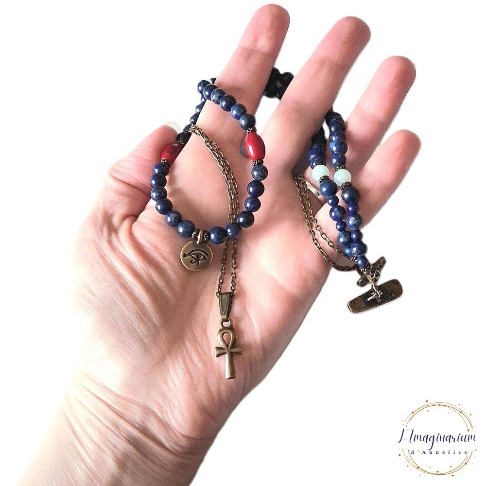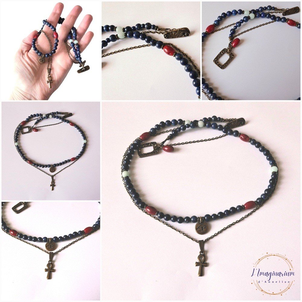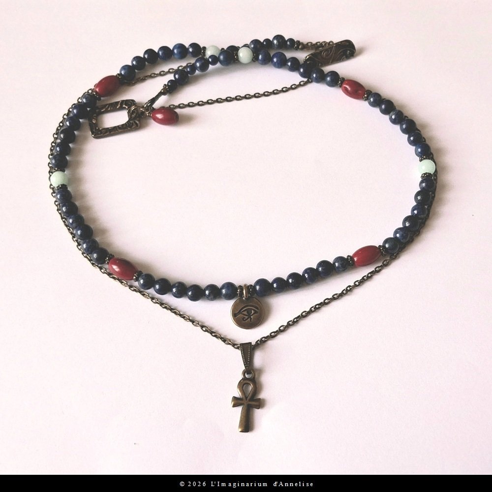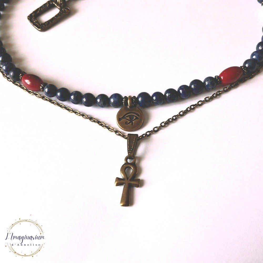 Voici Aerin, un très joli collier double rang en métal couleur bronze et pierres naturelles bleues et rouges : lapis lazuli 6 mm-6,5 mm, corail 11x7 mm et amazonite 6 mm avec 2 breloques style égyptien : une croix de Ankh et un oeil d'Horus.