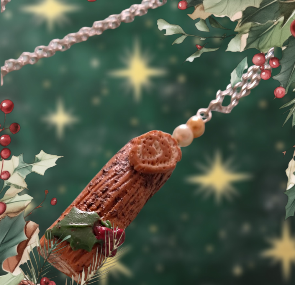 Ajoutez une touche festive et gourmande à votre look avec ce joli collier réalisé avec soin dans mon atelier. Il représente une délicieuse bûche de Noël au café, ornée d'une feuille de houx, d'une petite tranche de gâteau, et saupoudrée de café en poudre pour un effet réaliste.