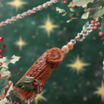 Collier artisanal, bûche de Noël au café avec feuille de houx et tranche de gâteau.