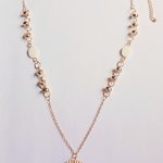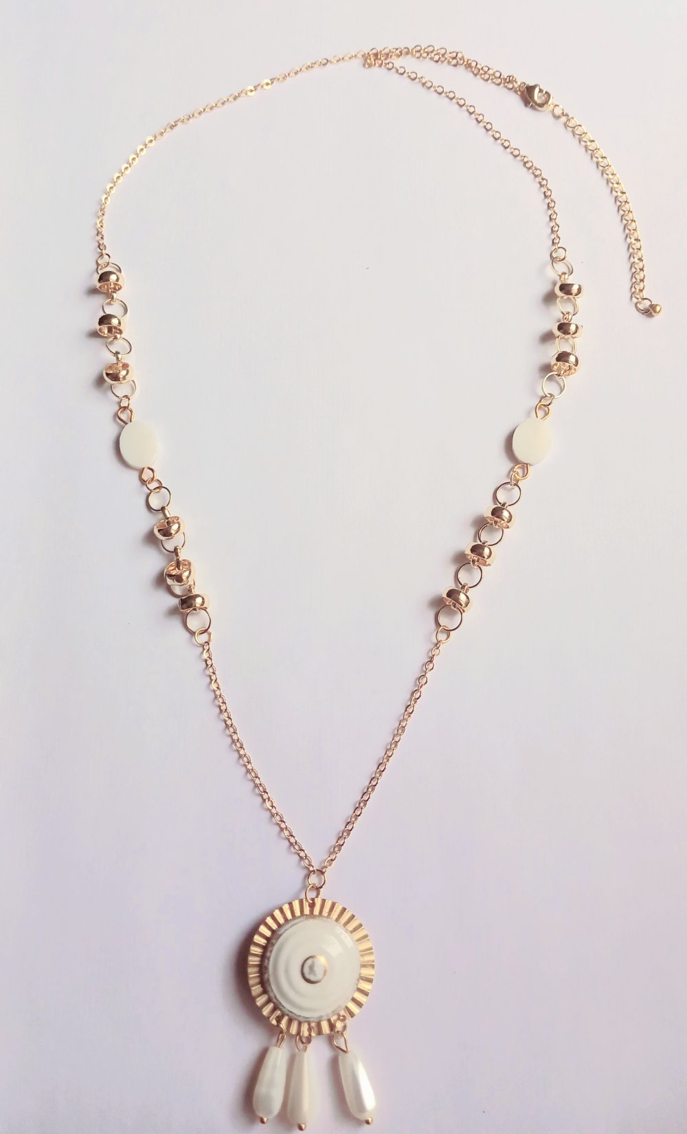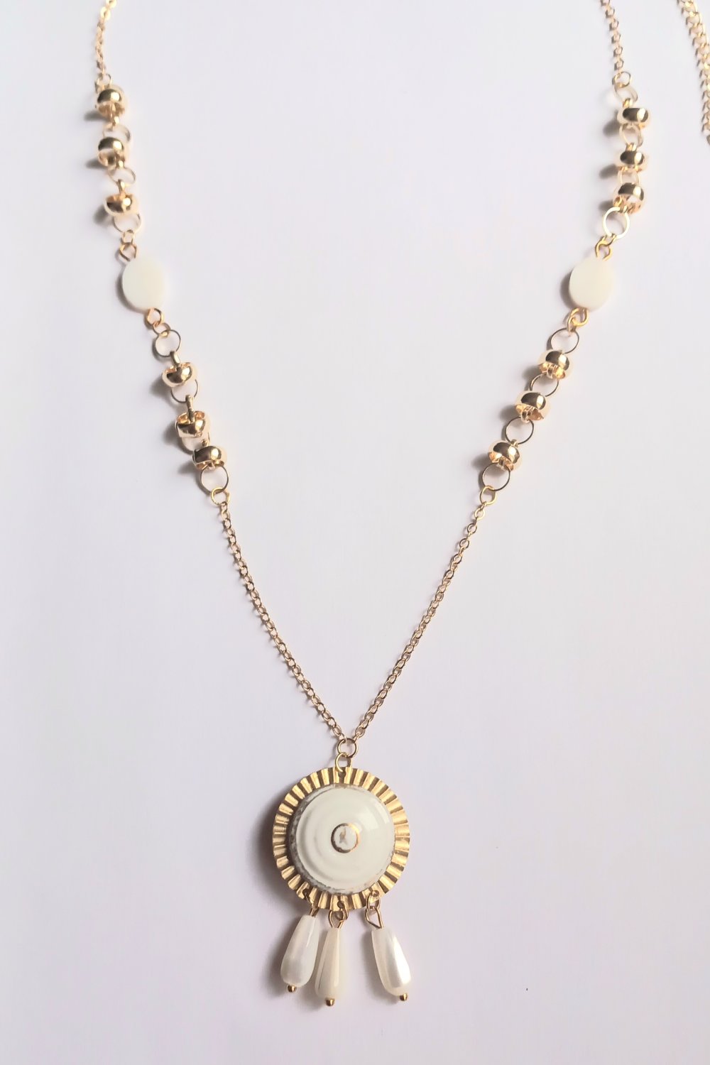 Collier mi-long réglable création personnelle, modèle unique en laiton plaqué or 18 carats et nacre.