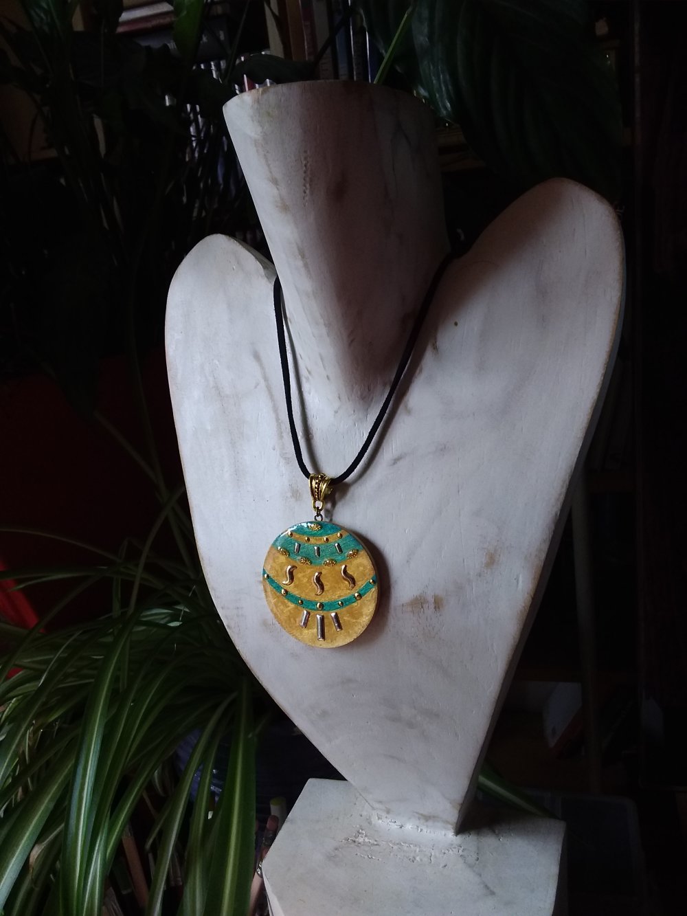 Joli collier avec un médaillon aux couleurs lumineuses....