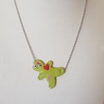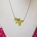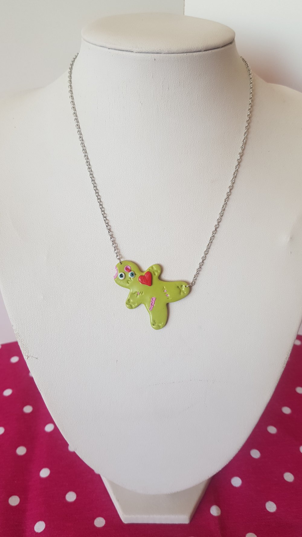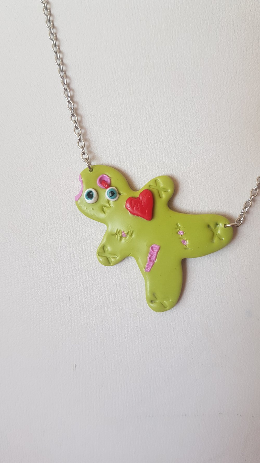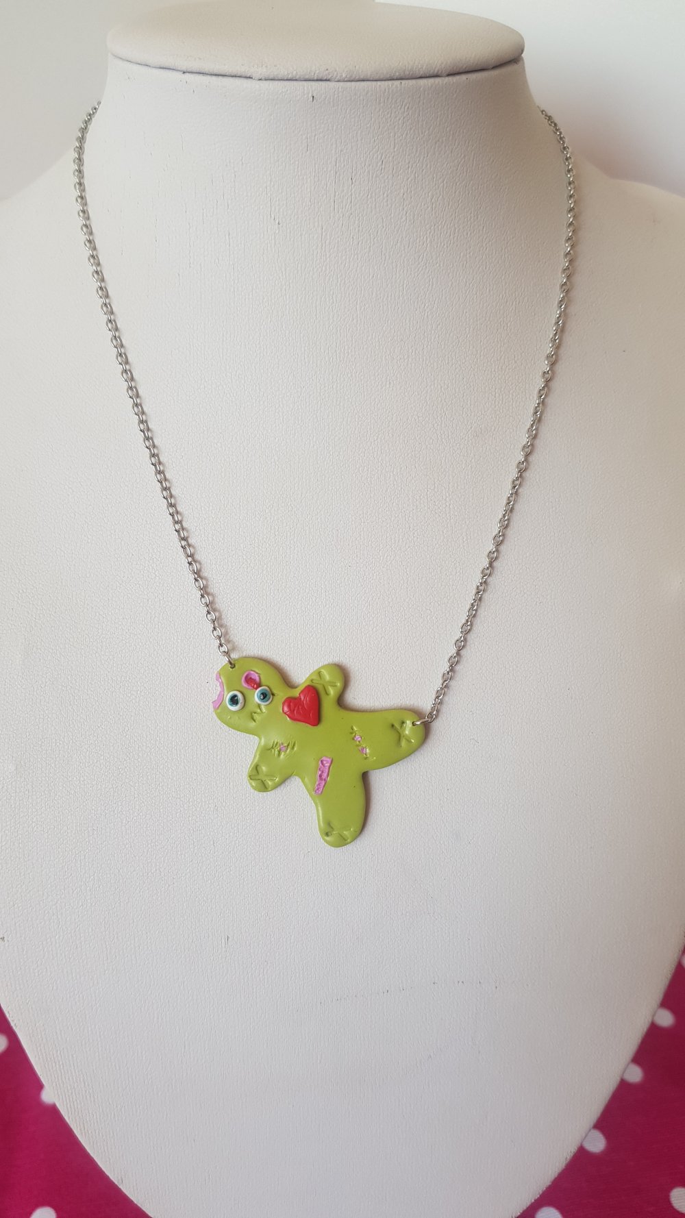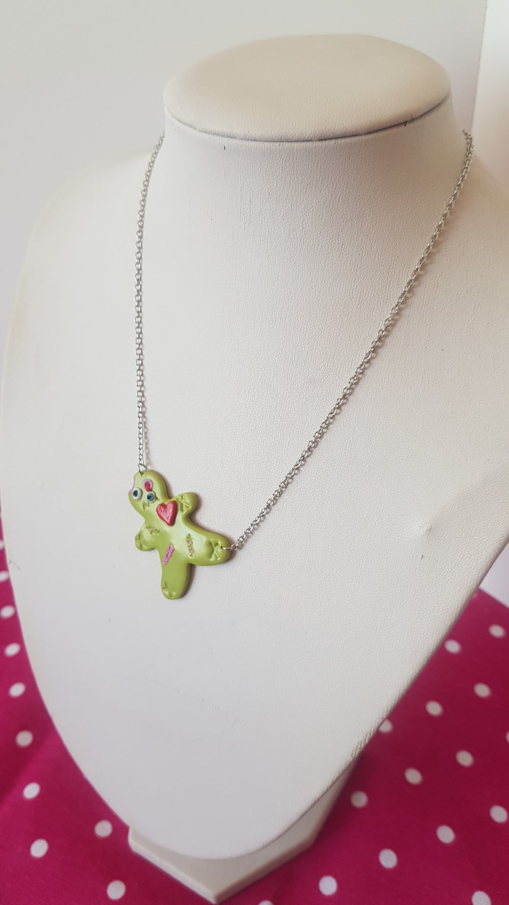 Superbe collier sur chaine en acier inoxydable, pendentif en forme du bonhomme de pain d'épices version zombie, original et décalé, il existe aussi en version classique et en version vaudou !