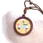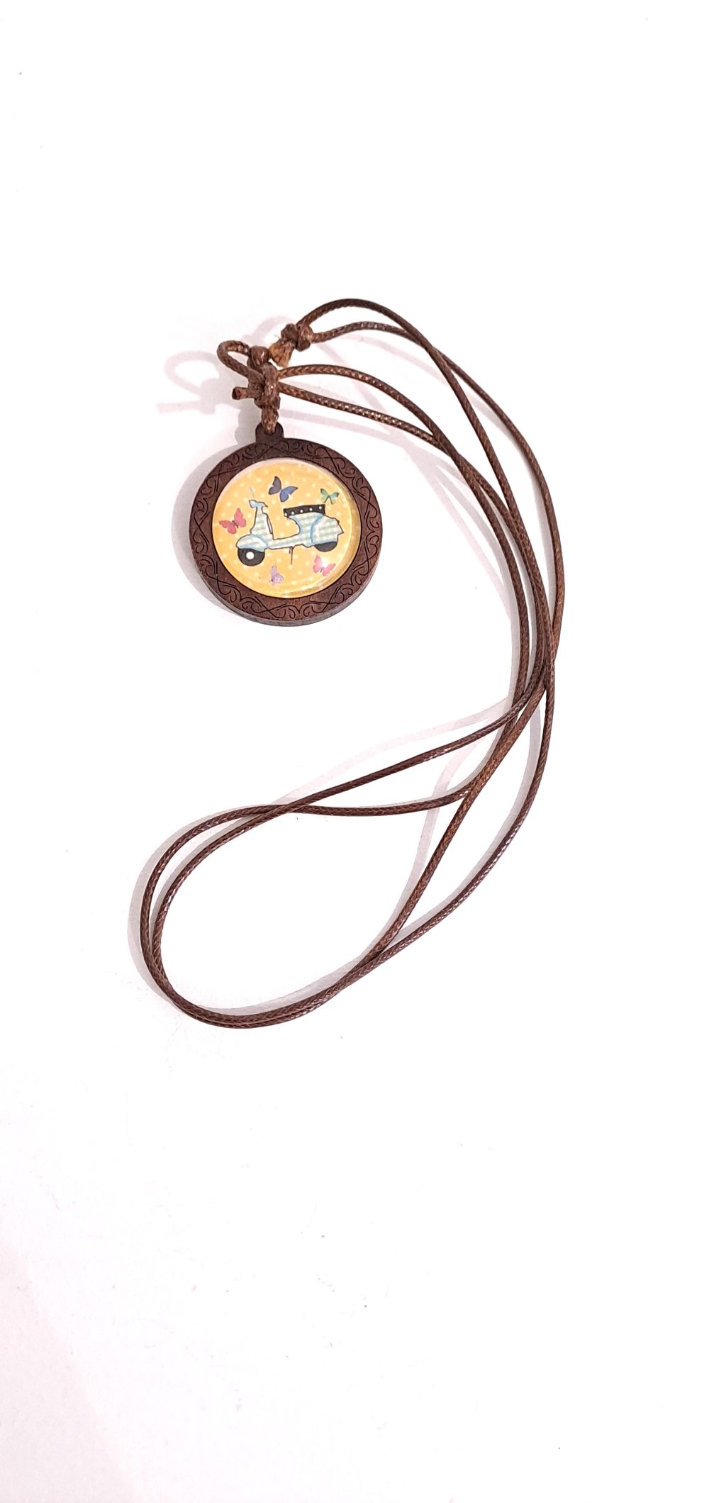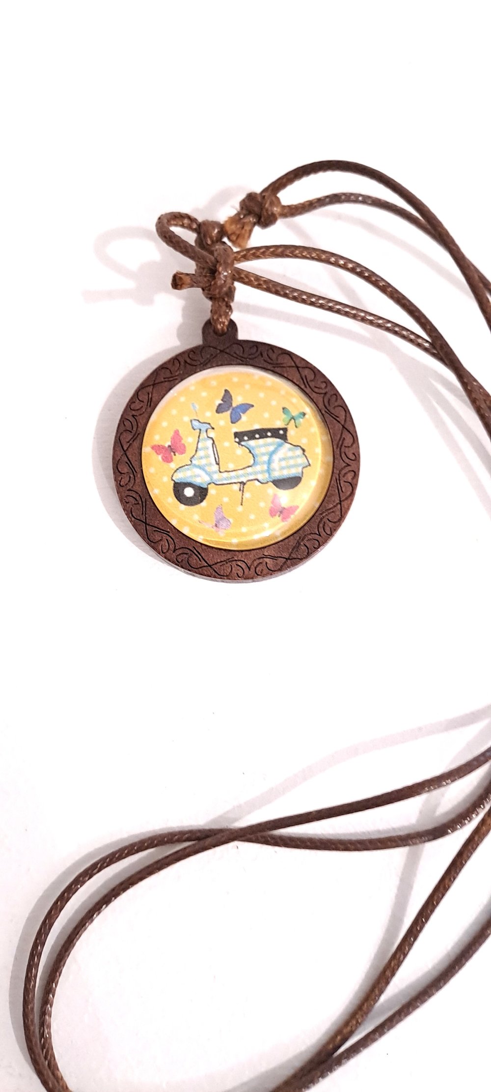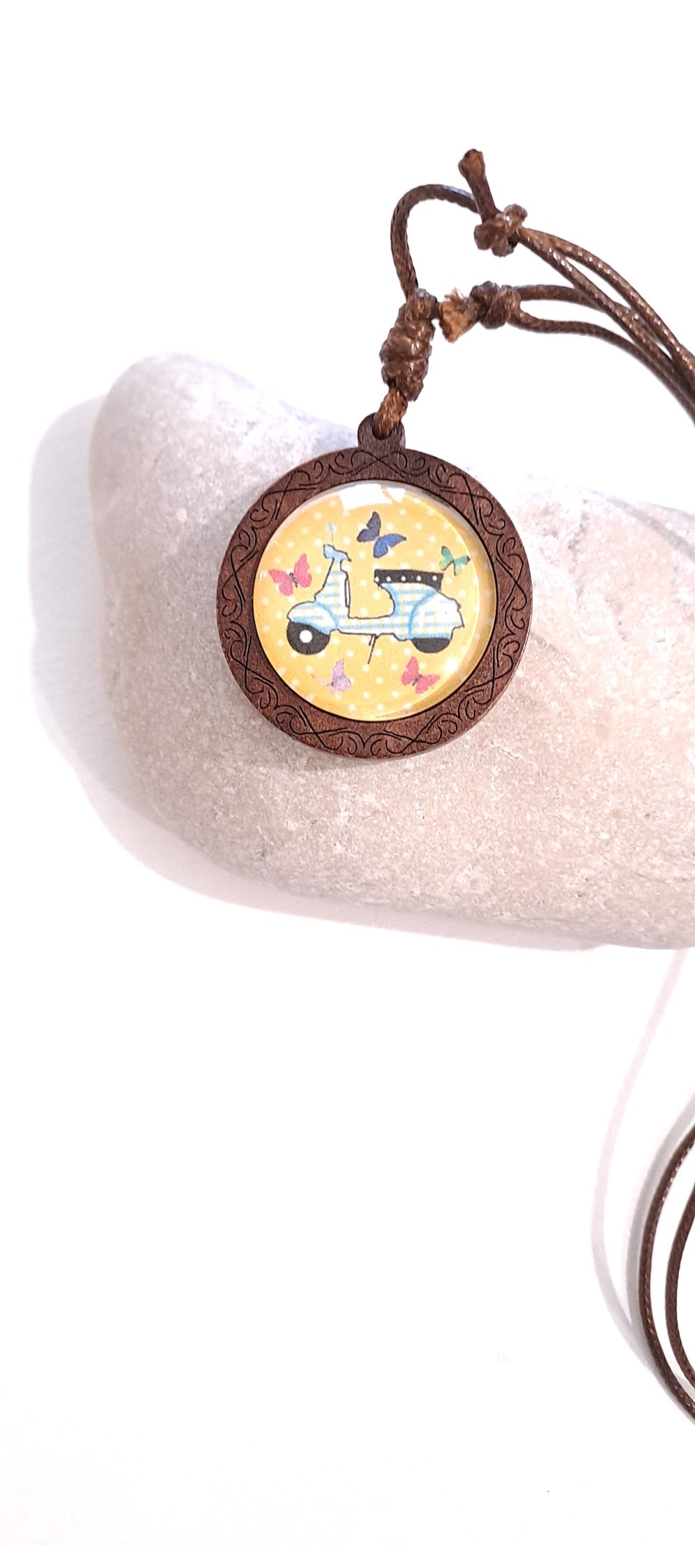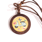 Collier fantaisie réglable cabochon bois et coton ciré , scooter vintage bleu