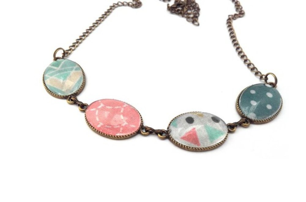 Le collier en métal couleur bronze se compose de quatre cabochons en verre à motifs en tissu.