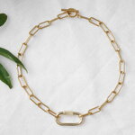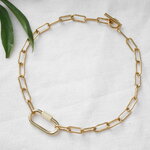 Ce collier est composé d'une chaîne épaisse en acier inoxydable doré et d'un mousqueton plaqué or 14 carats. Fermoir à bascule plaqué or à l'arrière. Modèle unisexe.