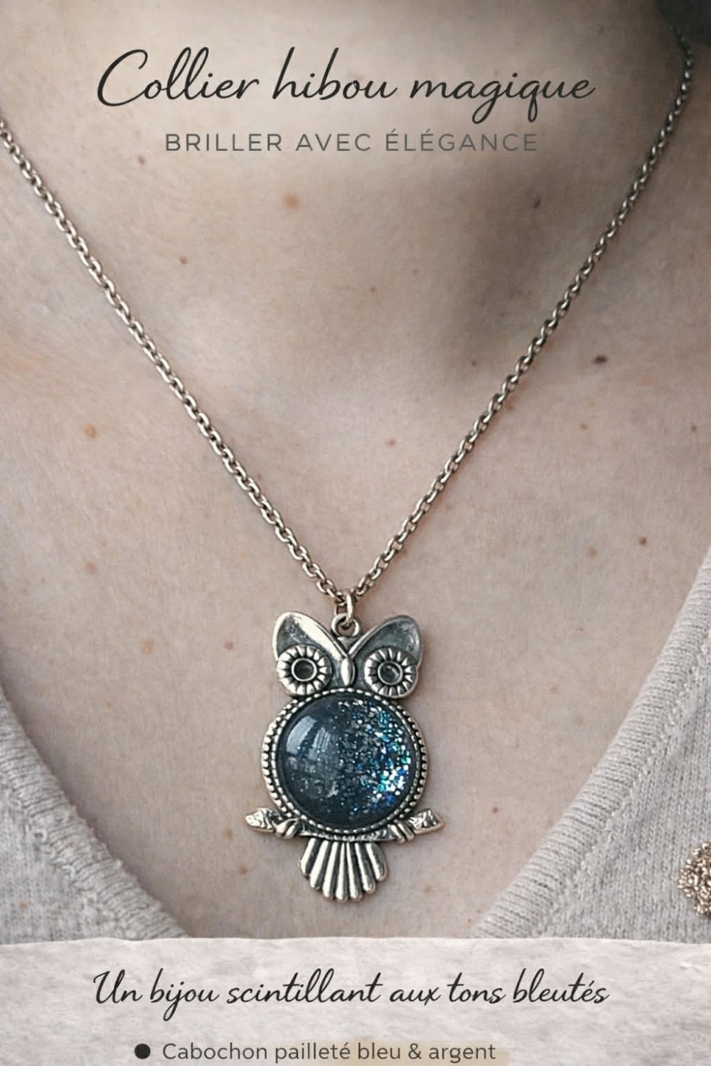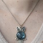 Chaîne en acier inoxydable de 45cm, pendentif chouette en argent vieilli avec son cabochon de 20mm avec un mélange de paillettes bleu turquoise et argenté sur fond noir.