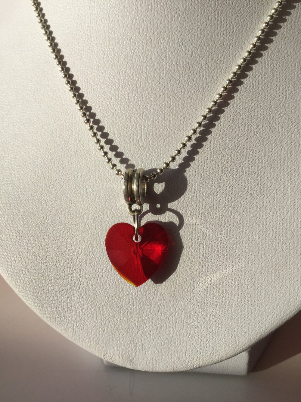 Collier mis long composé d'une chaine boule en métal argenté et d'un pendentif constitué par un beau coeur en résine translucide et facettée couleur rouge vif .