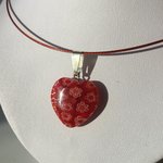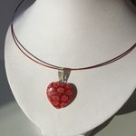 Collier ras du cou, très léger, composé d'un fil câblé couleur rouge de 45 cm auquel est suspendu un joli coeur en résine rouge translucide avec incrustations fleuries.