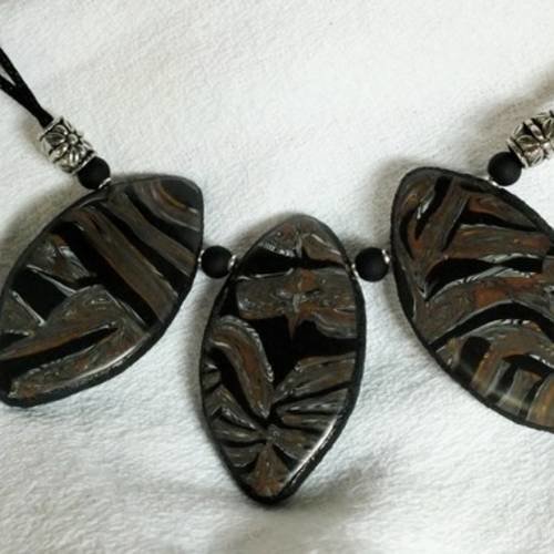 Trois pendentifs composent ce collier orné de perles noir mat et fini par des perles métal ajourées aux motifs fleur.