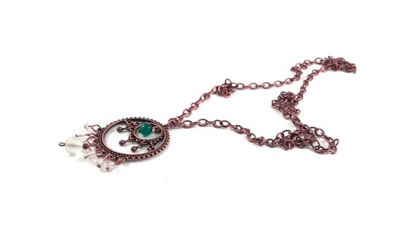 Sautoir cuivré à perles en verre. La grosse chaîne, le connecteur et les gouttes sont en métal coloris cuivre. Les perles sont en verre transparent et vert.